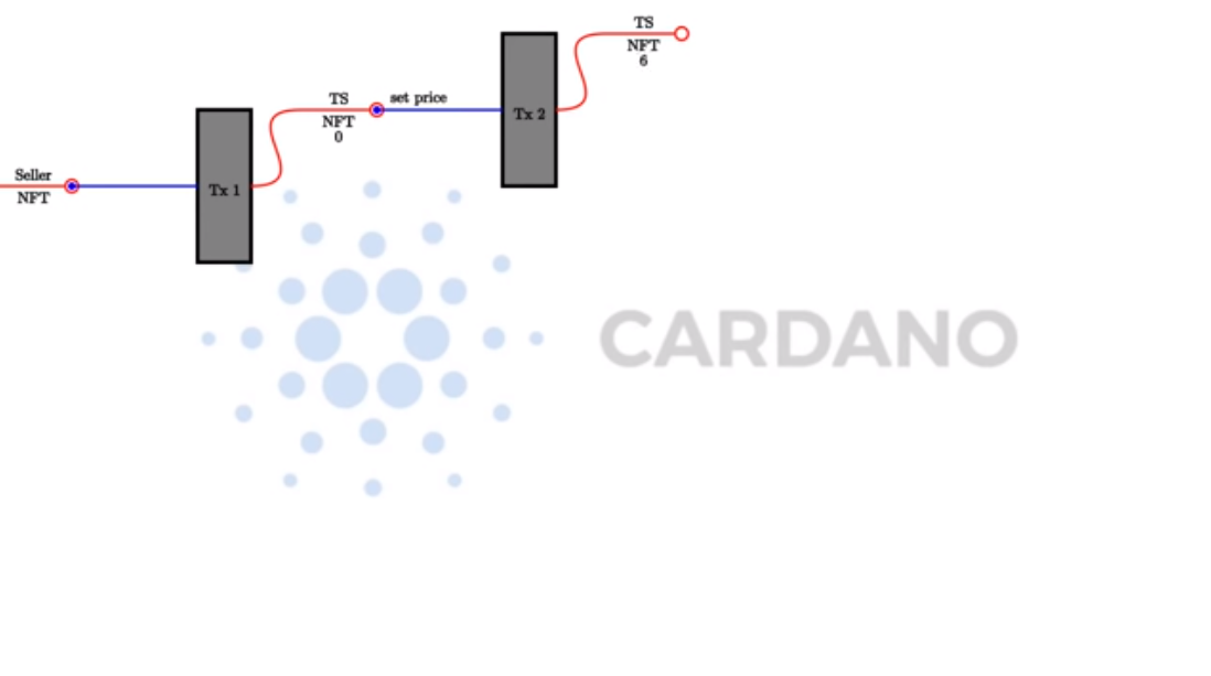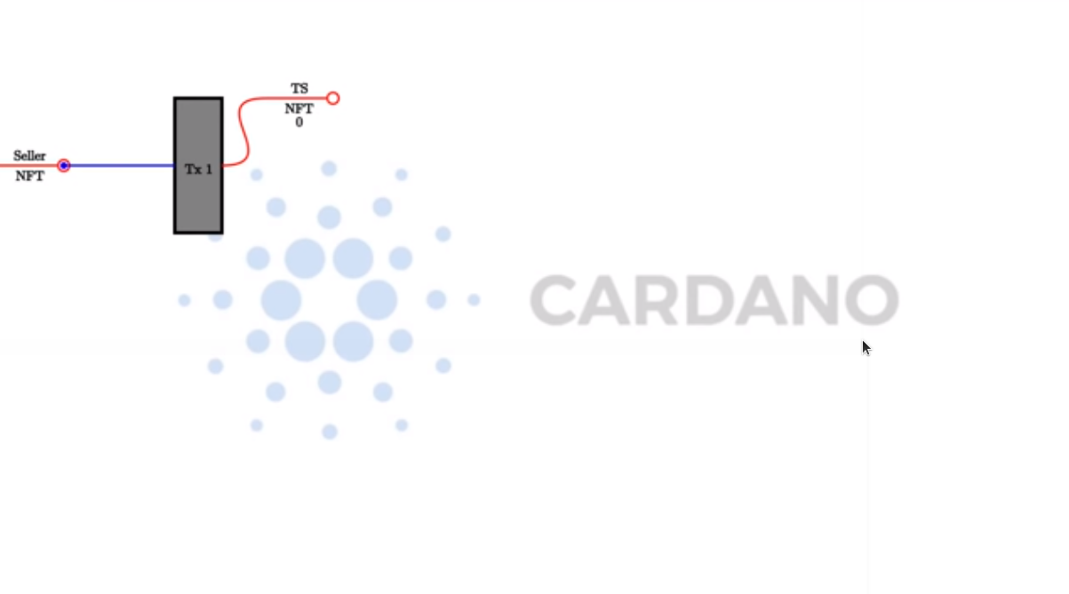 Để bắt đầu, người bán bắt đầu với một NFT. Nó có thể là một NFT tùy ý và nó sẽ chỉ được sử dụng, như trước đây, để xác định đúng UTxO có chứa trạng thái hợp đồng.