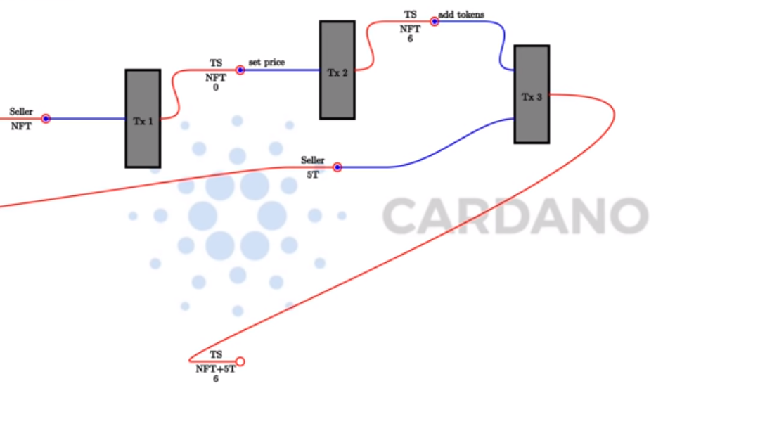 Một điều khác mà người bán có thể làm là khóa một số token trong hợp đồng. Để làm được điều đó, họ phải tạo một giao dịch khác có đầu vào là UTxO của hợp đồng và UTxO chứa một số token và như đầu ra, UTxO được cập nhật tại địa chỉ hợp đồng hiện chứa các token được cung cấp.