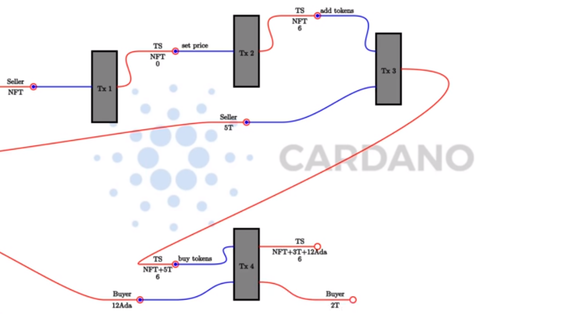 Vì vậy, nếu người mua muốn mua hai token, họ sẽ tạo một giao dịch có đầu vào là 12 Ada và UTxO tại địa chỉ tập lệnh. Sau đó, hai đầu ra. Một trạng thái hợp đồng được cập nhật mà bây giờ các token được lấy ra và Ada đã được thêm vào, và một đầu ra sẽ đến tay người mua với các token mà họ vừa mua.