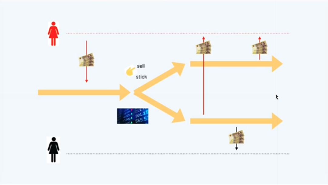 Sau đó, nếu và khi Charlie đưa ra lựa chọn, chúng tôi tiếp tục, và điều đó bây giờ phụ thuộc vào sự lựa chọn mà anh ấy đã đưa ra. Nếu anh ta chọn Alice thì Alice phải nhận được tất cả tiền, nếu anh ta chọn Bob thì Bob phải nhận được tất cả tiền.