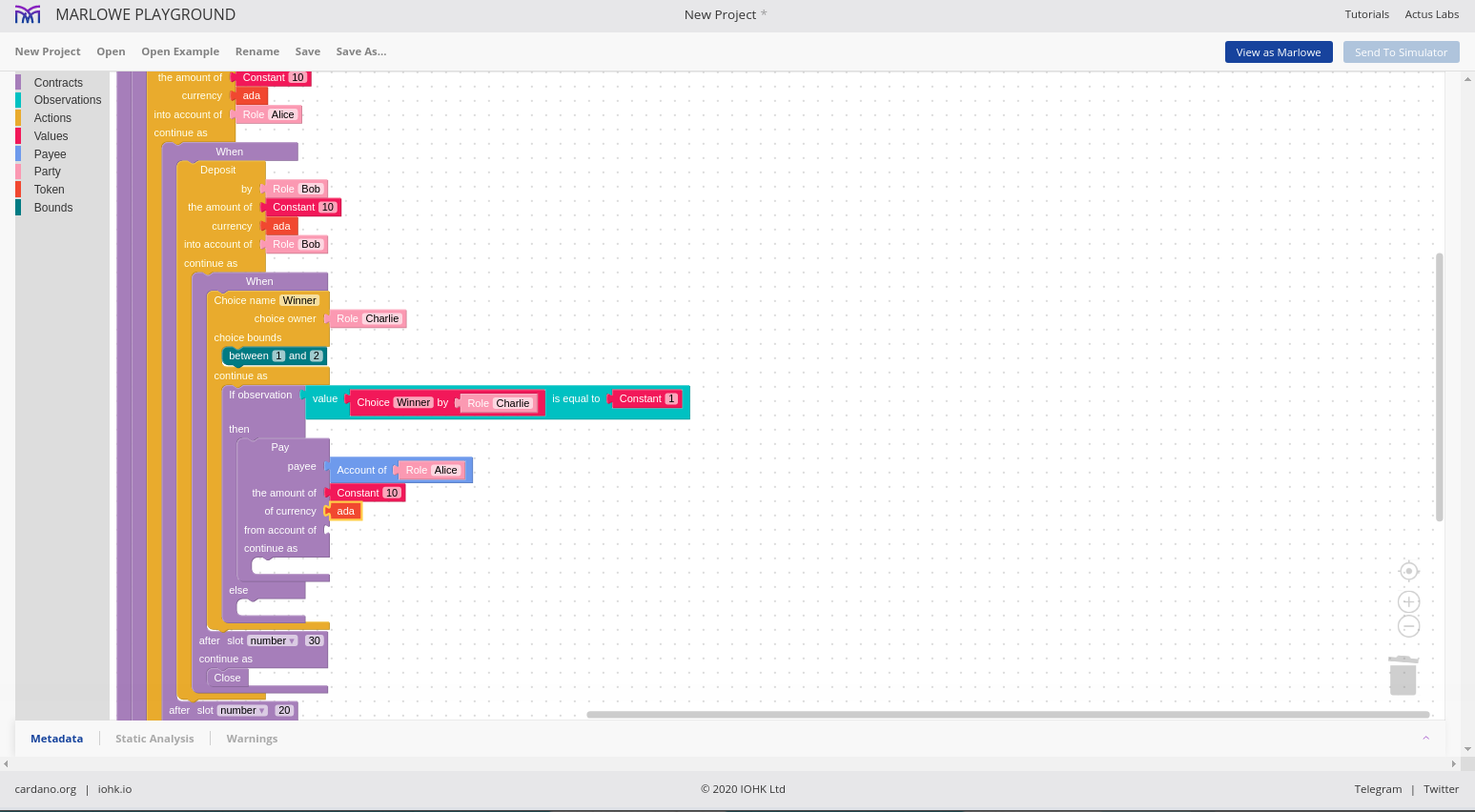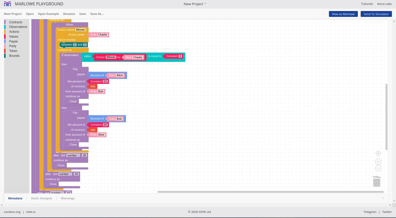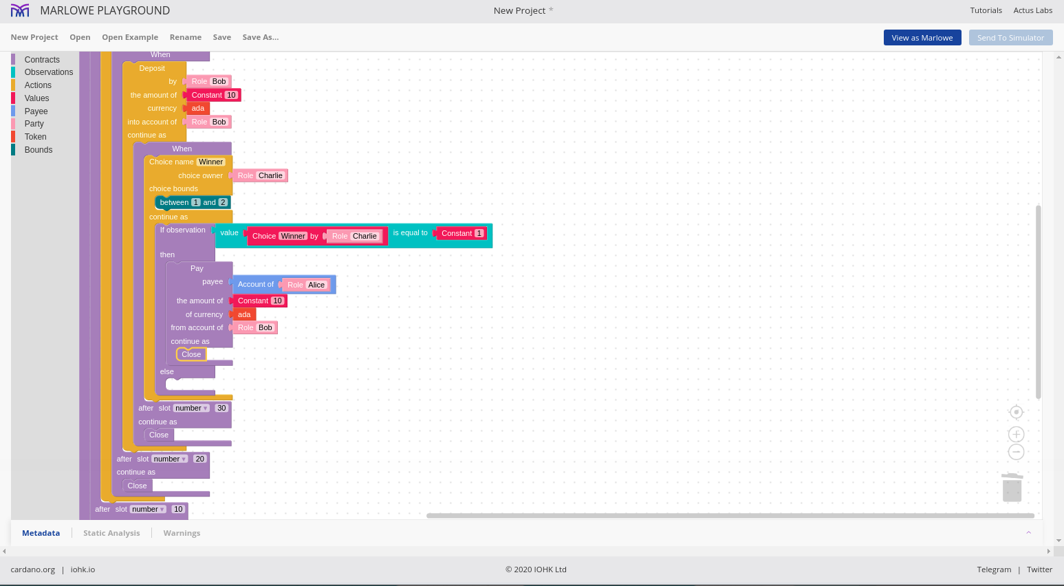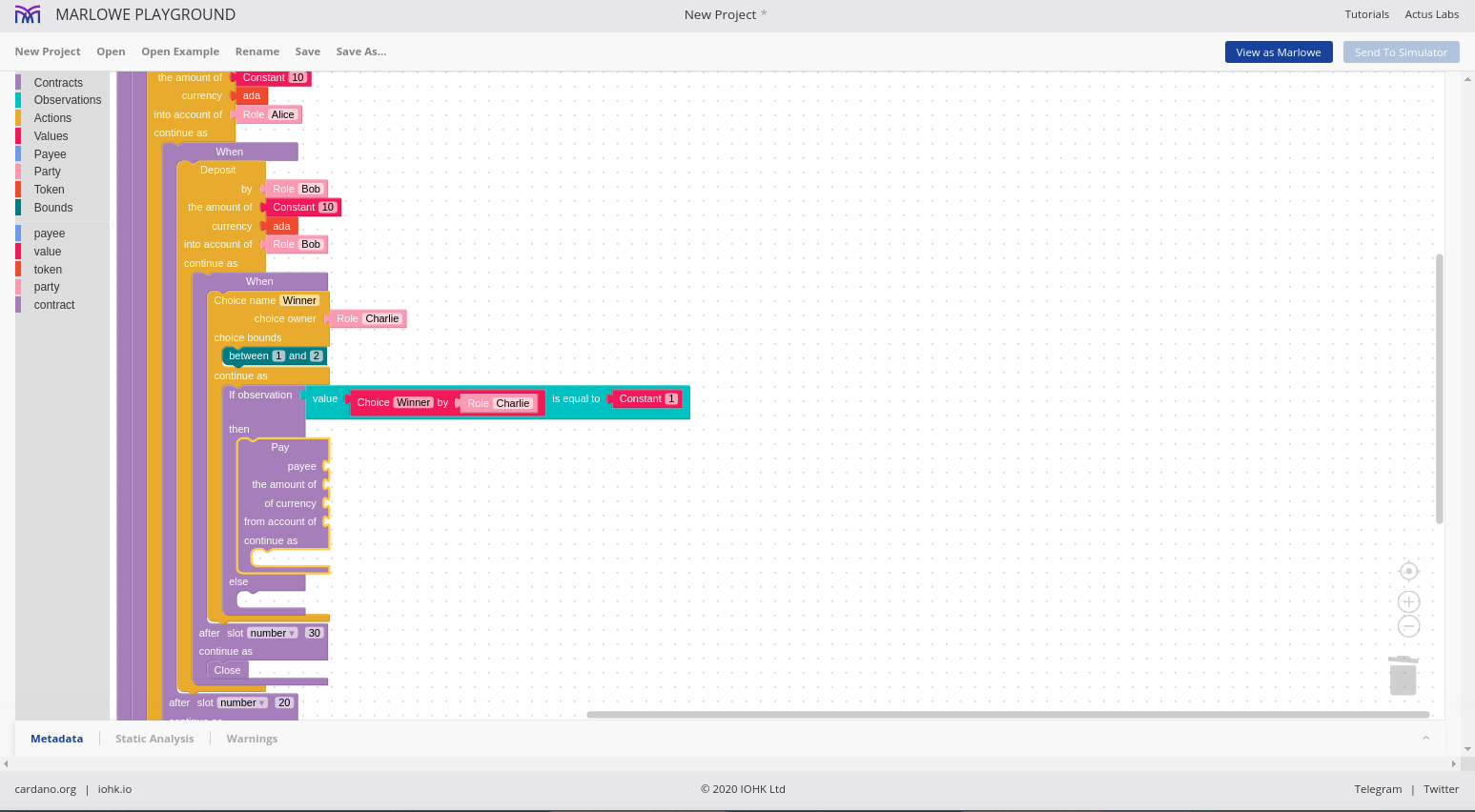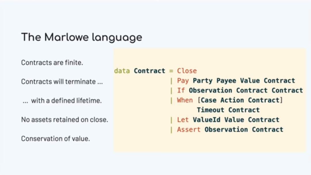 Đó là ngôn ngữ Marlowe, và chúng ta sẽ thấy rằng chúng ta có thể sử dụng những ngôn ngữ này để xây dựng các hợp đồng Marlowe theo nhiều cách khác nhau.
