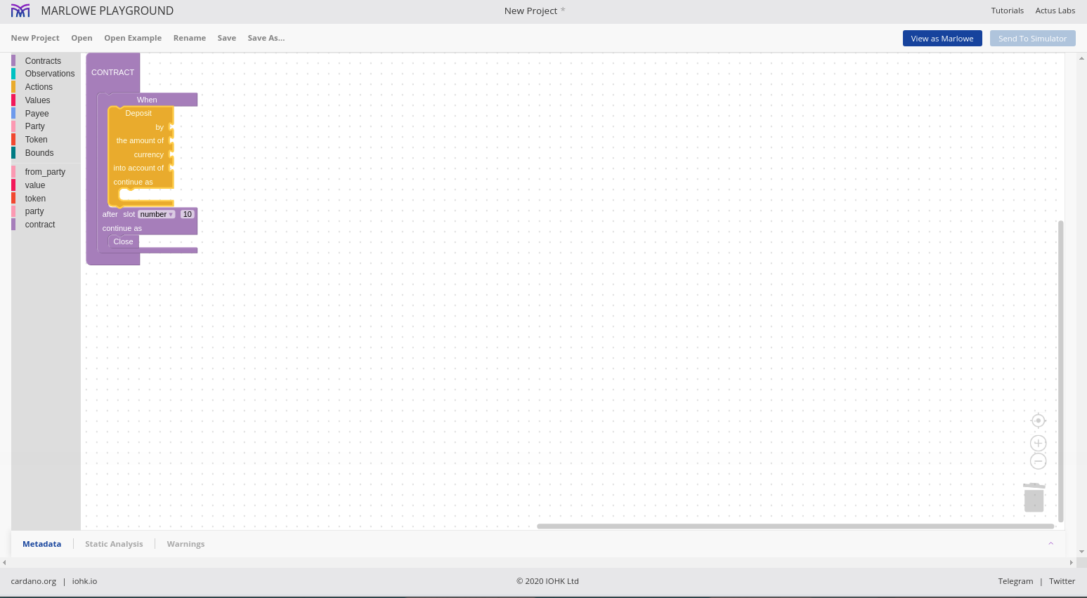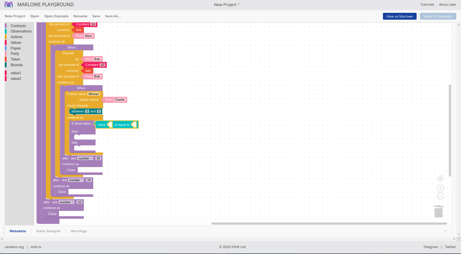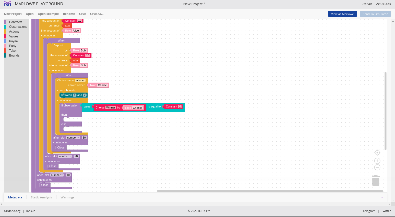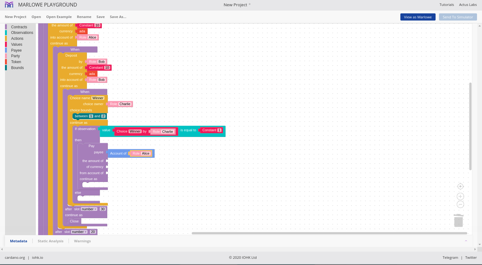 Đó là ngôn ngữ Marlowe, và chúng ta sẽ thấy rằng chúng ta có thể sử dụng những ngôn ngữ này để xây dựng các hợp đồng Marlowe theo nhiều cách khác nhau.