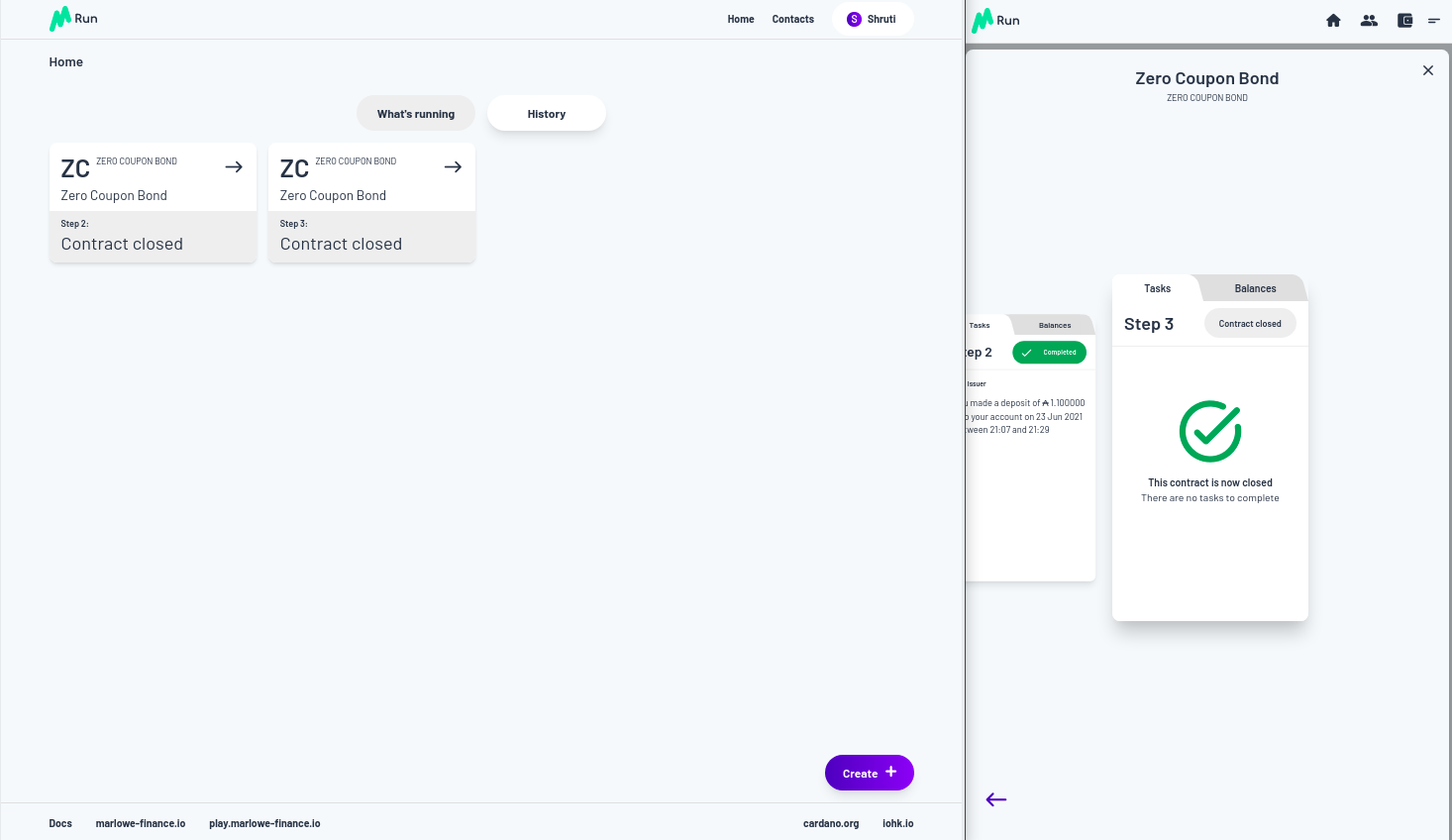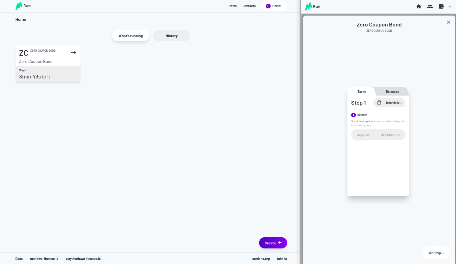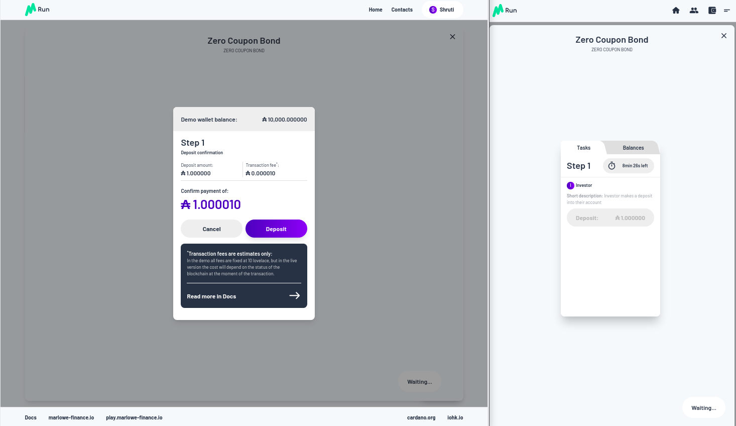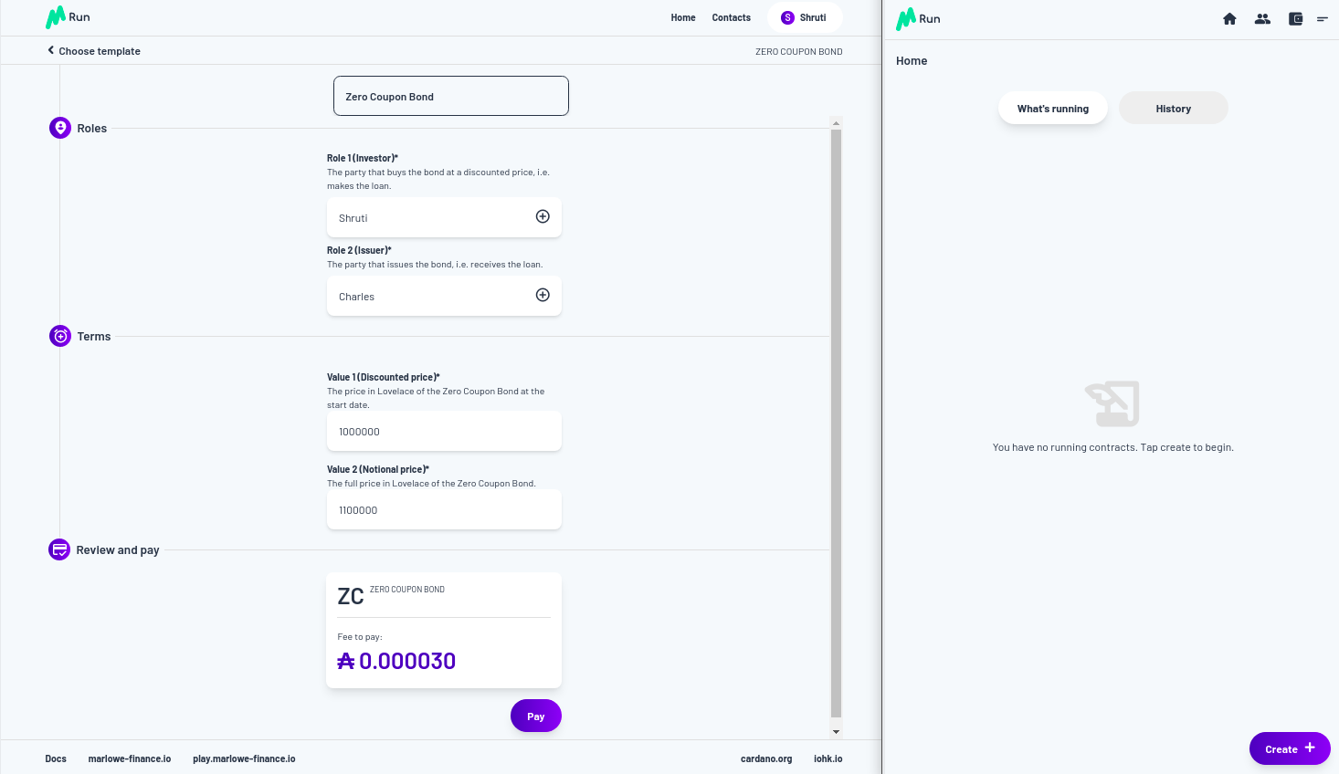 Vì vậy, chúng ta hãy trả tiền. Chúng tôi được yêu cầu phê duyệt và việc thanh toán được thực hiện. Bạn có thể thấy bây giờ trong Marlowe Run của Shruti, chúng ta đã có Zero Coupon Bond đang chạy, ngoài ra, nếu bạn nhìn vào quan điểm của Charles về thế giới, nó cũng đang chạy ở đó đối với anh ấy.