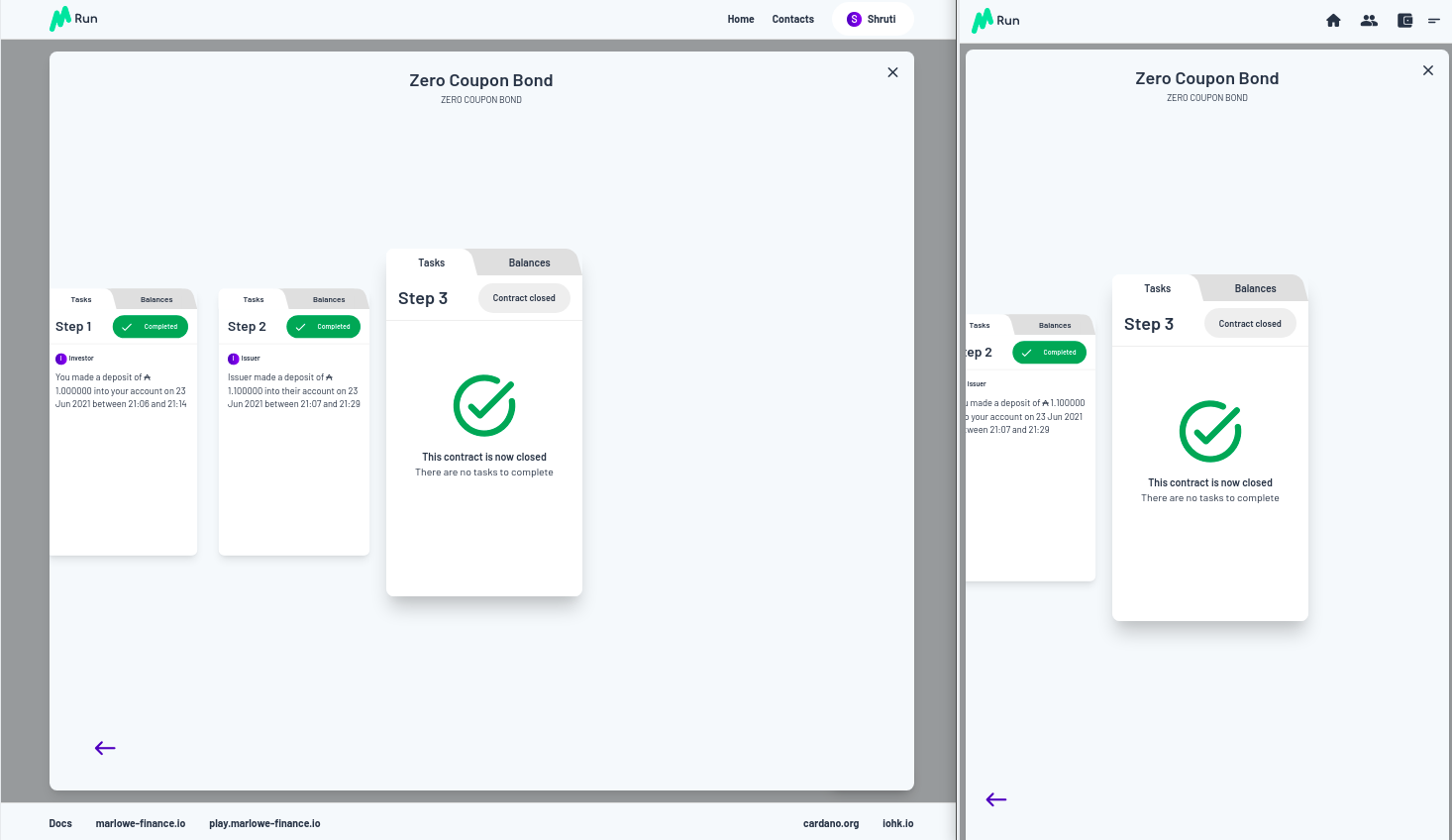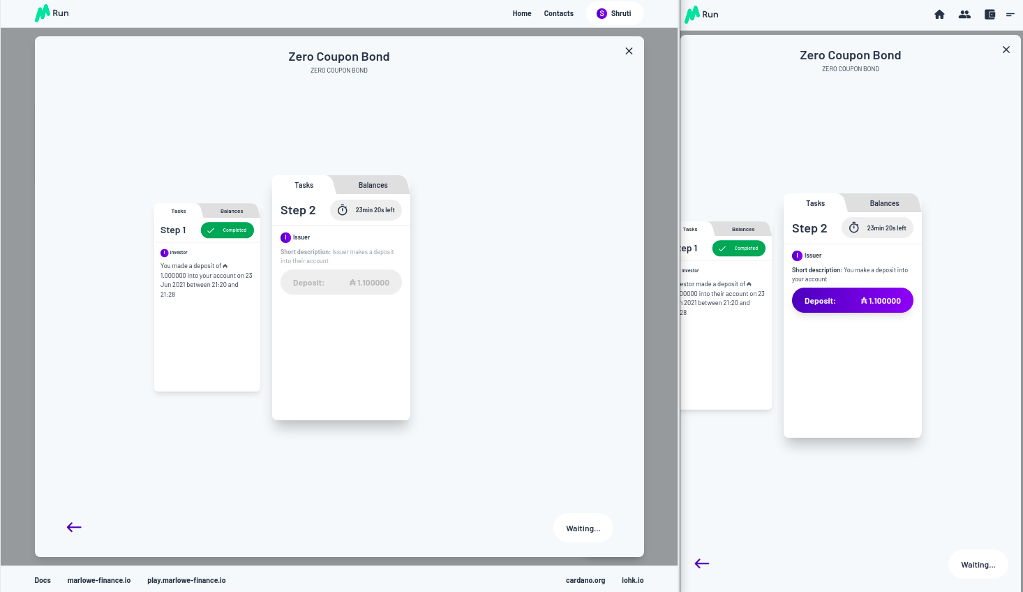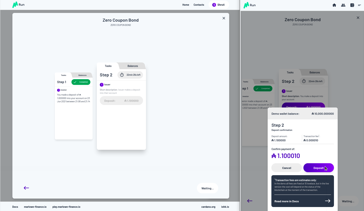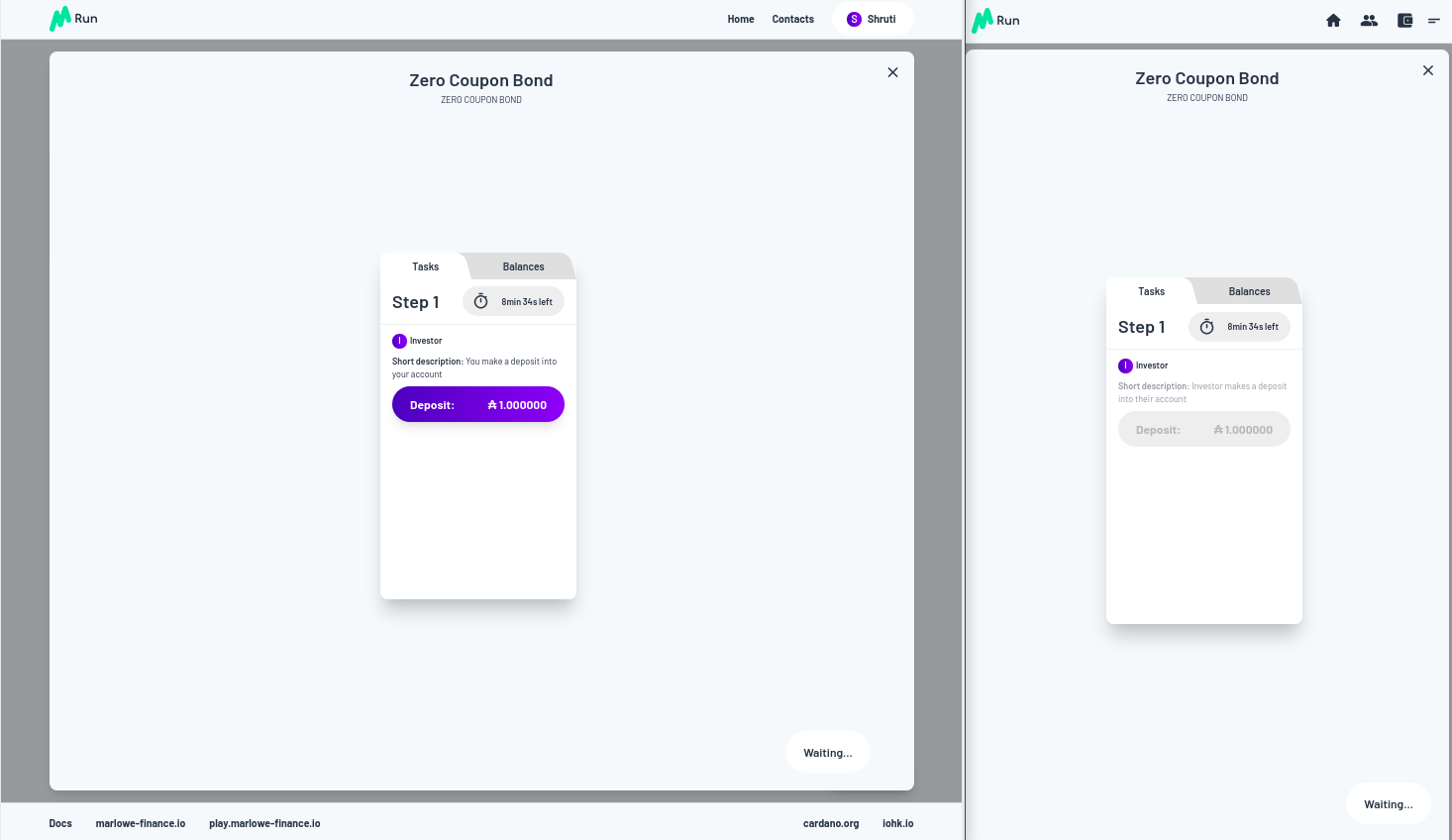 Vì vậy, chúng ta hãy trả tiền. Chúng tôi được yêu cầu phê duyệt và việc thanh toán được thực hiện. Bạn có thể thấy bây giờ trong Marlowe Run của Shruti, chúng ta đã có Zero Coupon Bond đang chạy, ngoài ra, nếu bạn nhìn vào quan điểm của Charles về thế giới, nó cũng đang chạy ở đó đối với anh ấy.