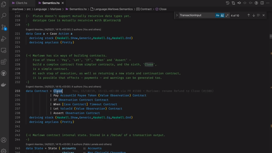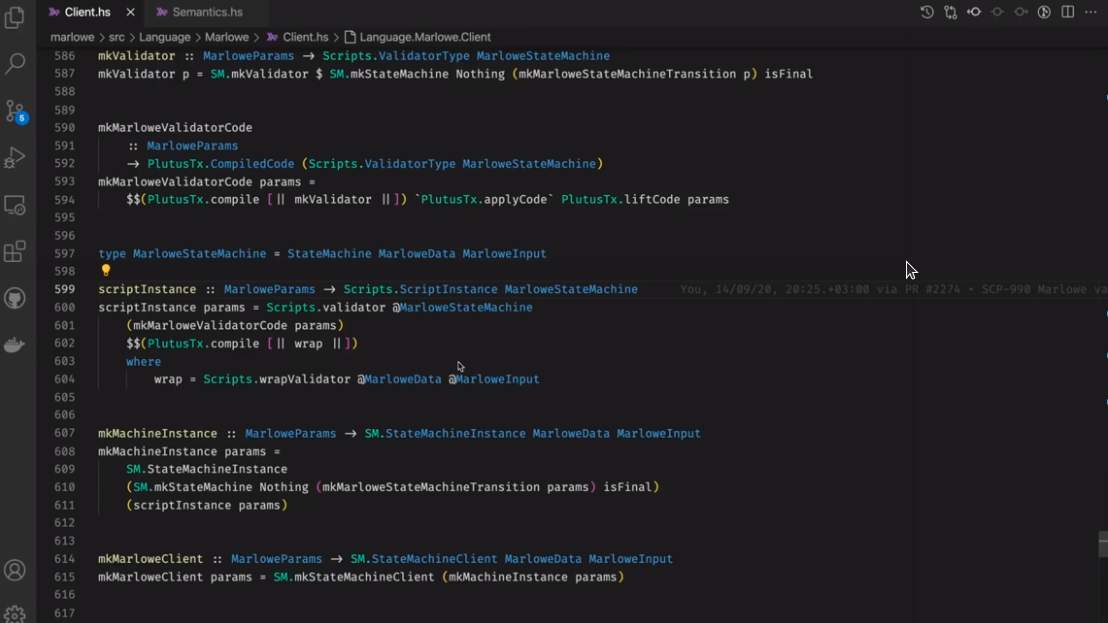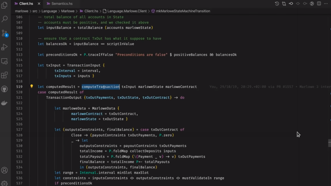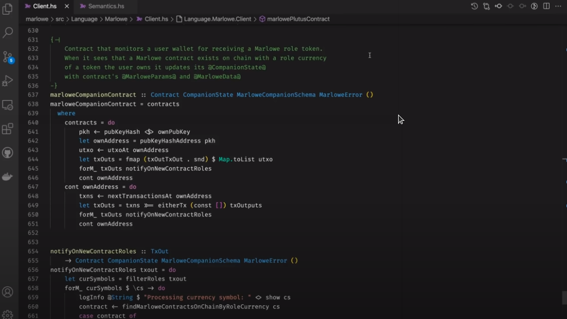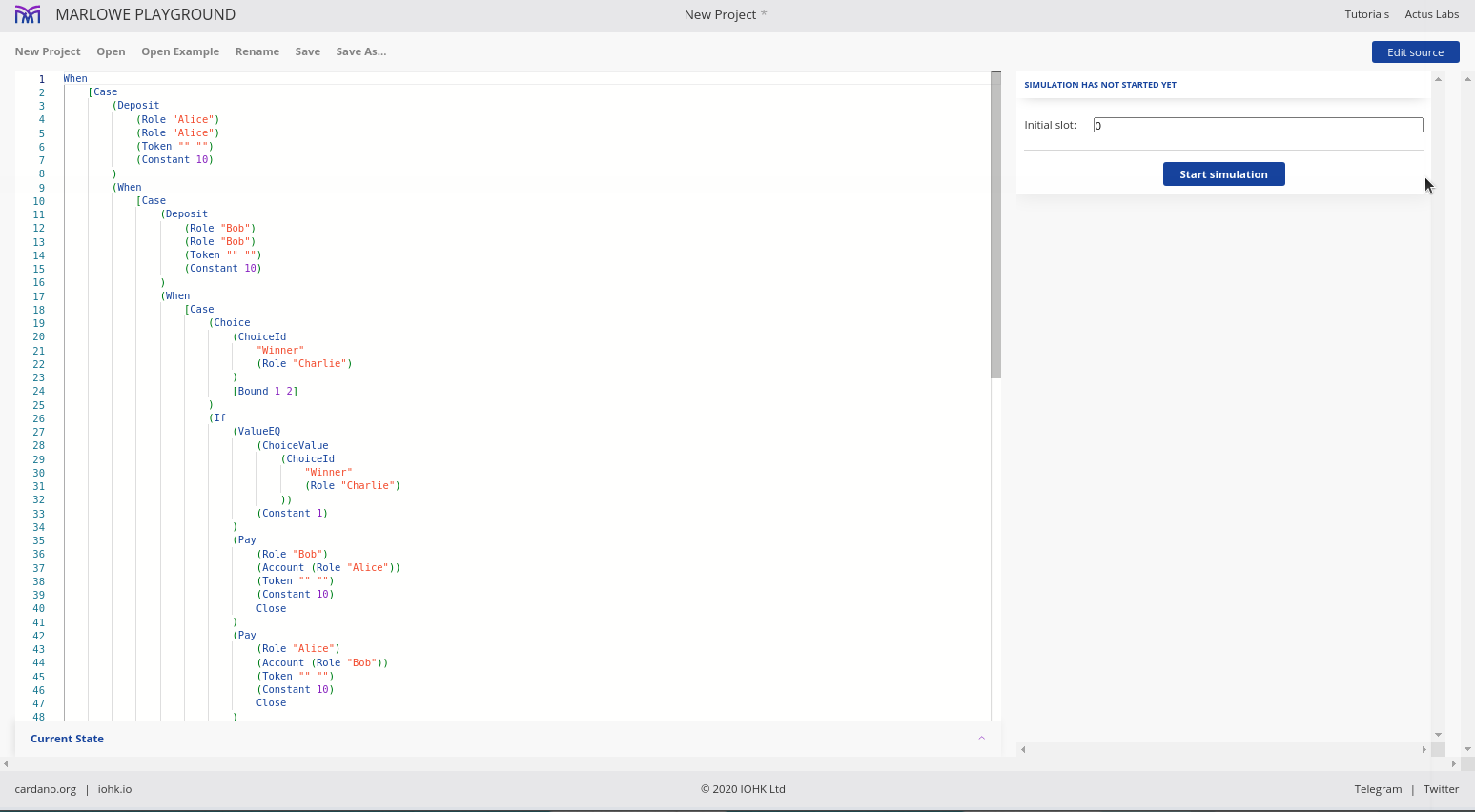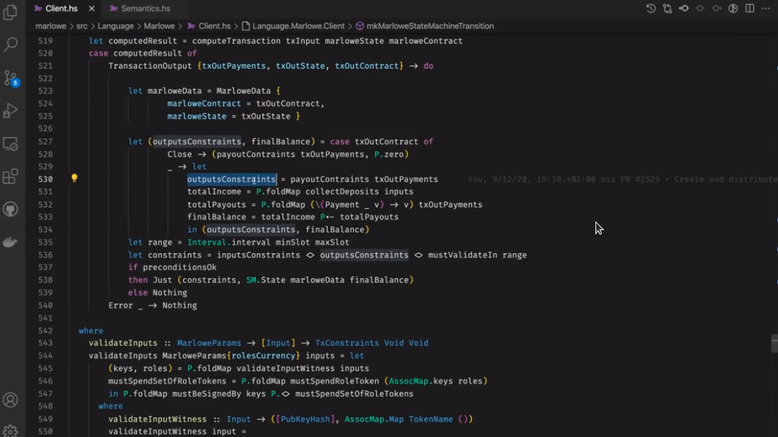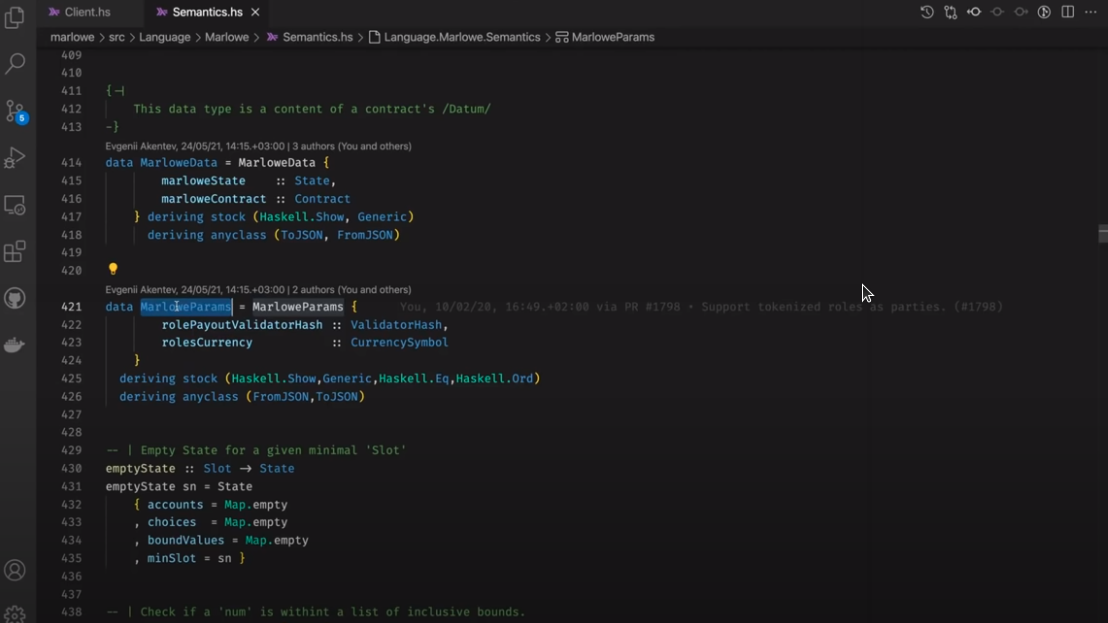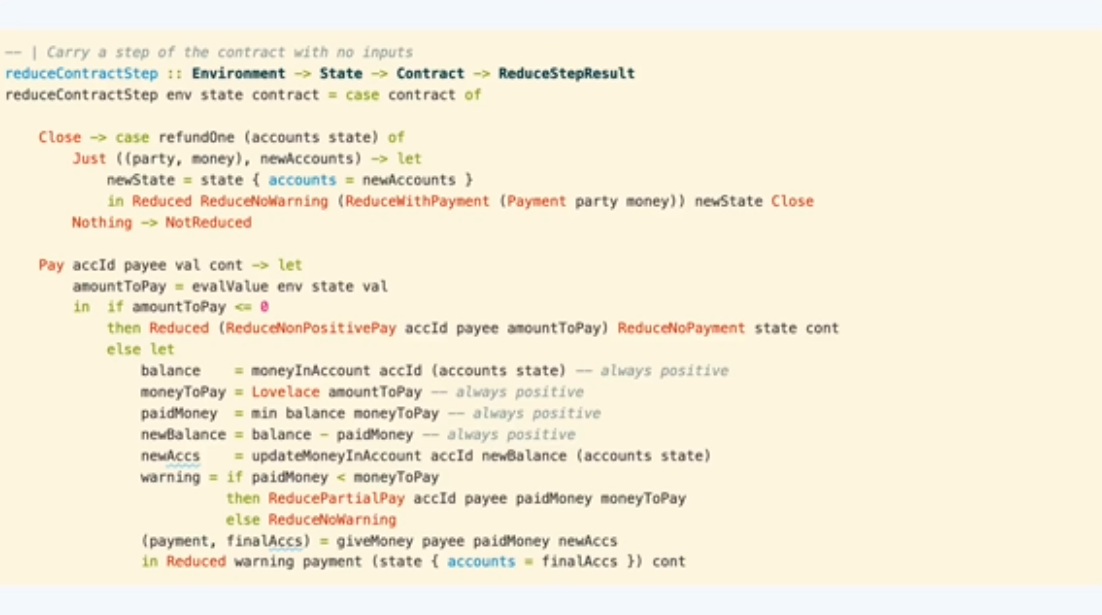 Điều đáng chú ý ở đây là Marlowe, trái ngược với Plutus, rất đơn giản là Haskell. Nhóm Marlowe đã đưa ra quan điểm là chỉ sử dụng các tính năng Haskell cơ bản. Bạn không cần ống kính, bạn không cần Template Haskell, bạn thậm chí không cần monads hoặc lập trình cấp kiểu.