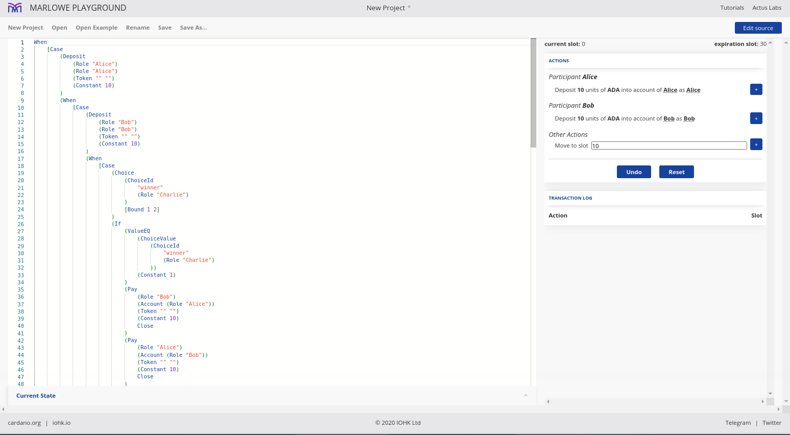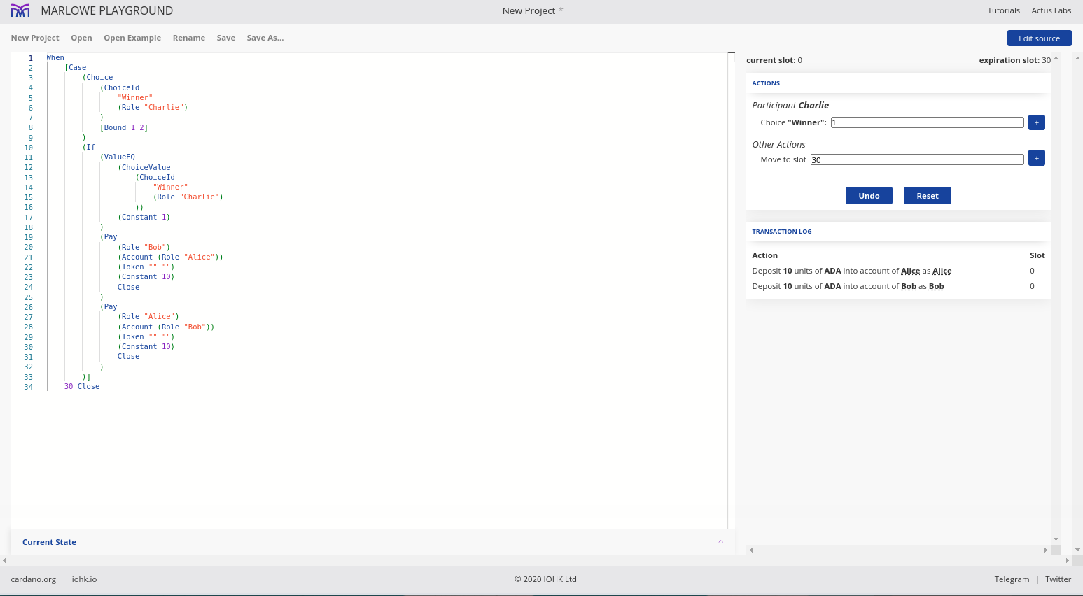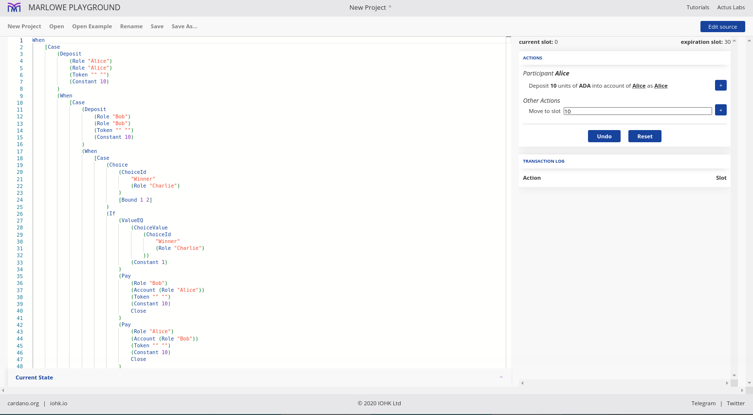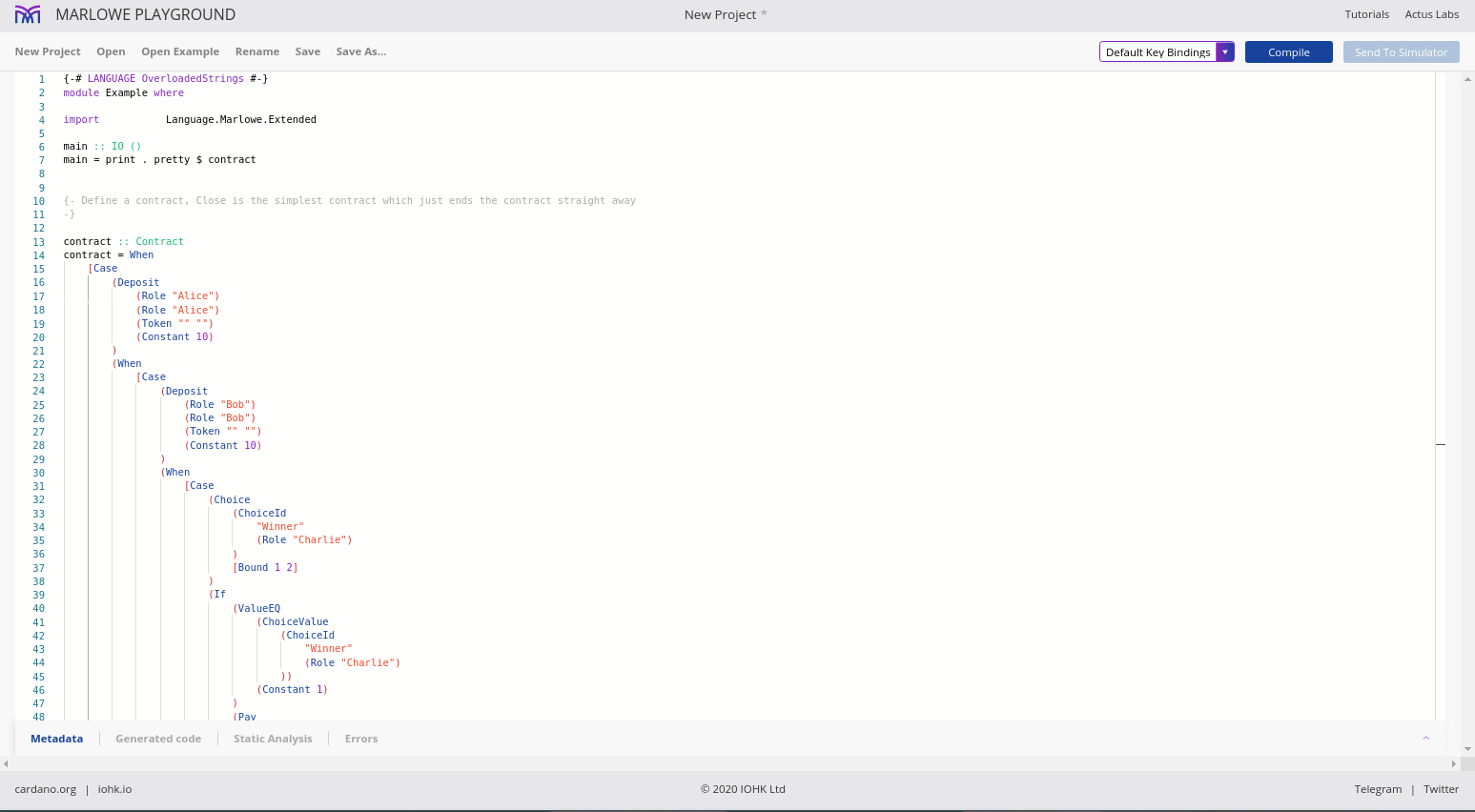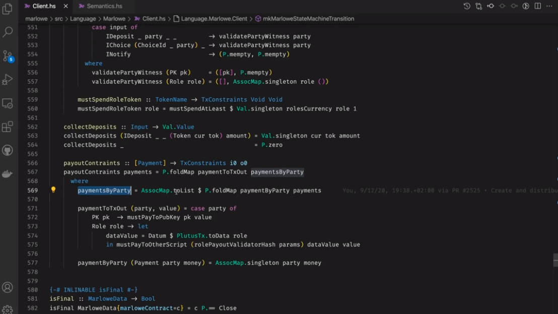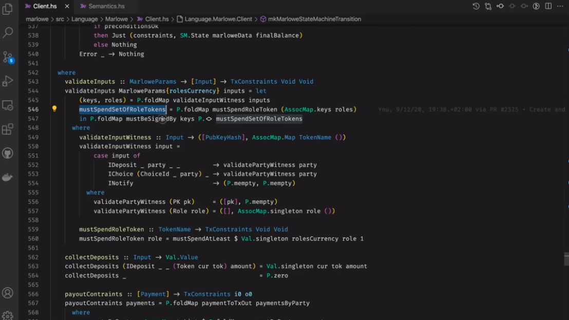 Điều đáng chú ý ở đây là Marlowe, trái ngược với Plutus, rất đơn giản là Haskell. Nhóm Marlowe đã đưa ra quan điểm là chỉ sử dụng các tính năng Haskell cơ bản. Bạn không cần ống kính, bạn không cần Template Haskell, bạn thậm chí không cần monads hoặc lập trình cấp kiểu.