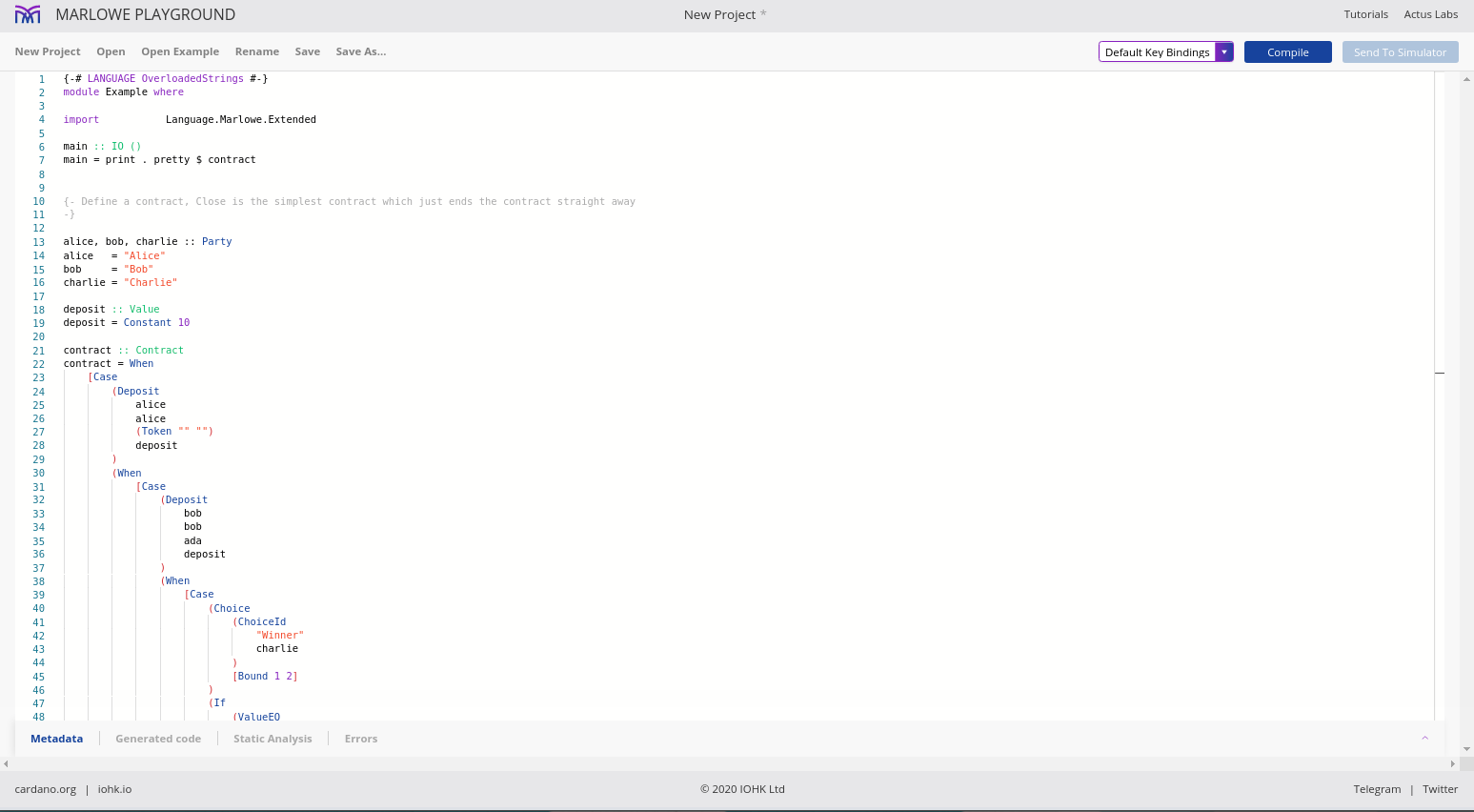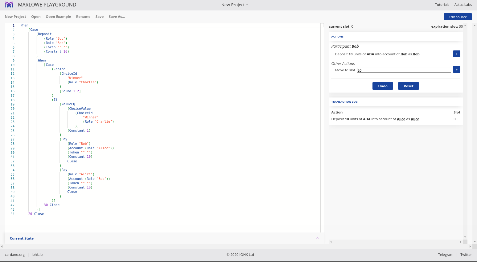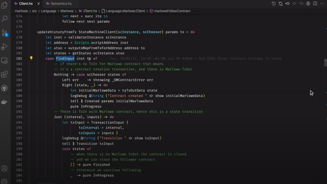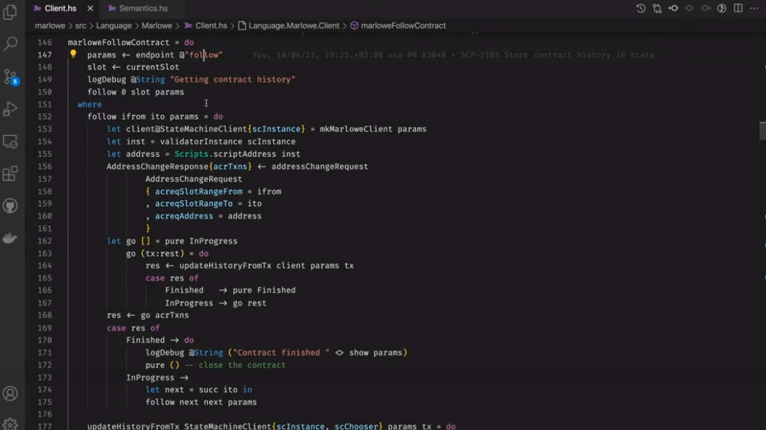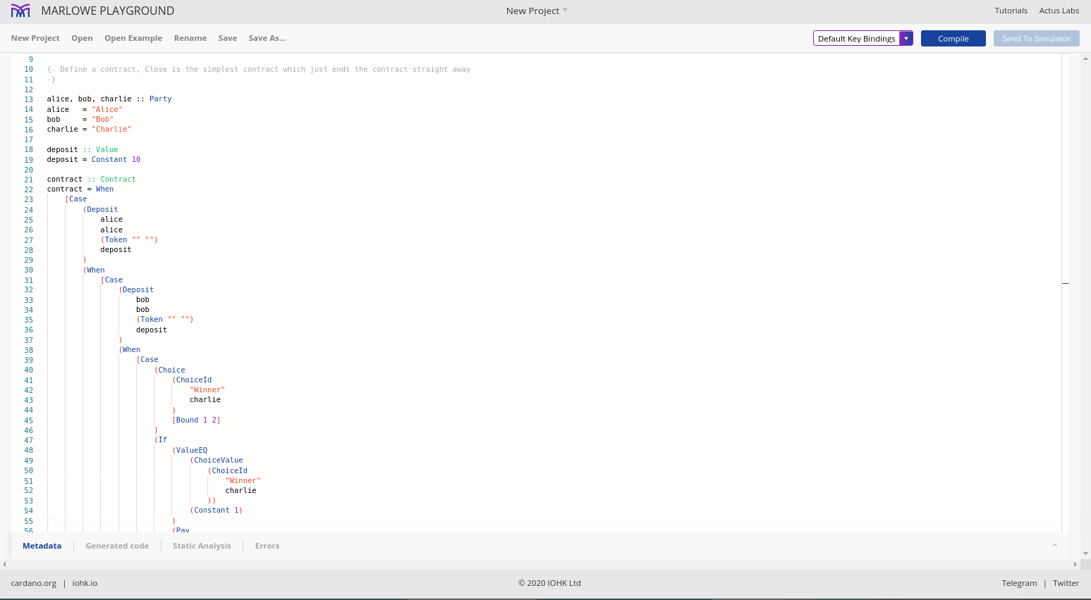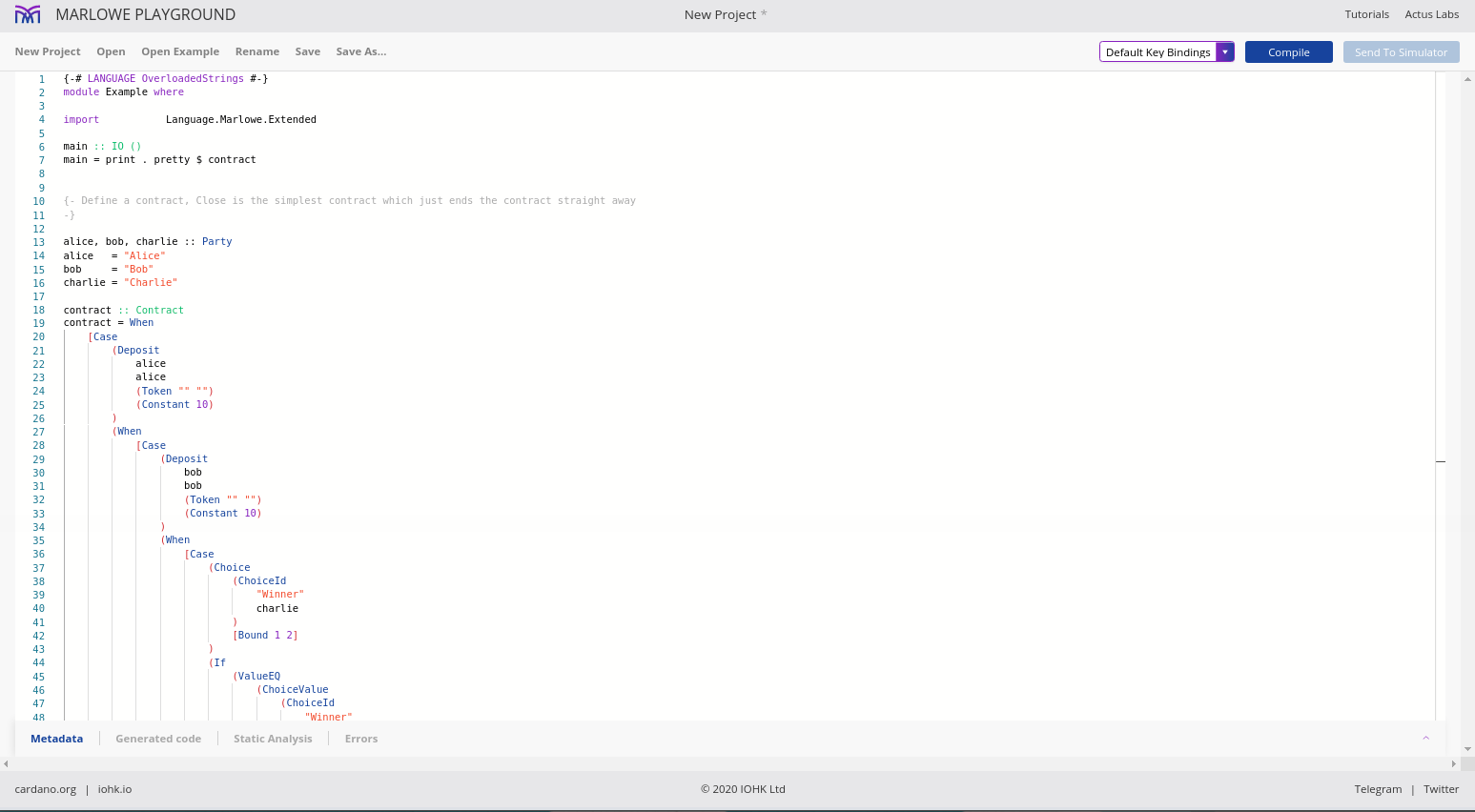 Điều đáng chú ý ở đây là Marlowe, trái ngược với Plutus, rất đơn giản là Haskell. Nhóm Marlowe đã đưa ra quan điểm là chỉ sử dụng các tính năng Haskell cơ bản. Bạn không cần ống kính, bạn không cần Template Haskell, bạn thậm chí không cần monads hoặc lập trình cấp kiểu.