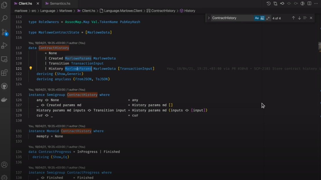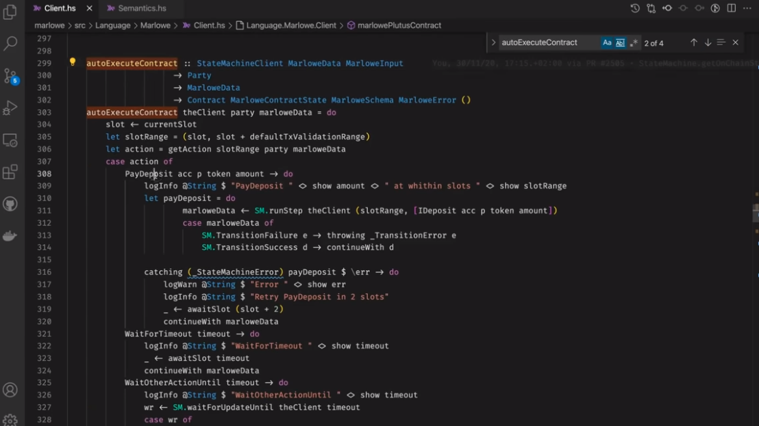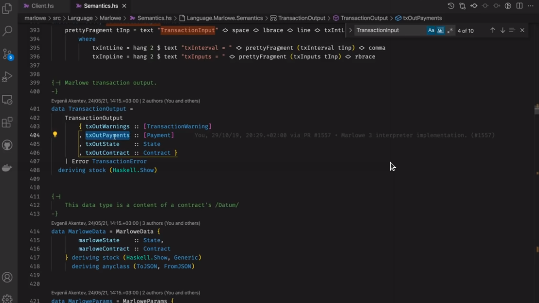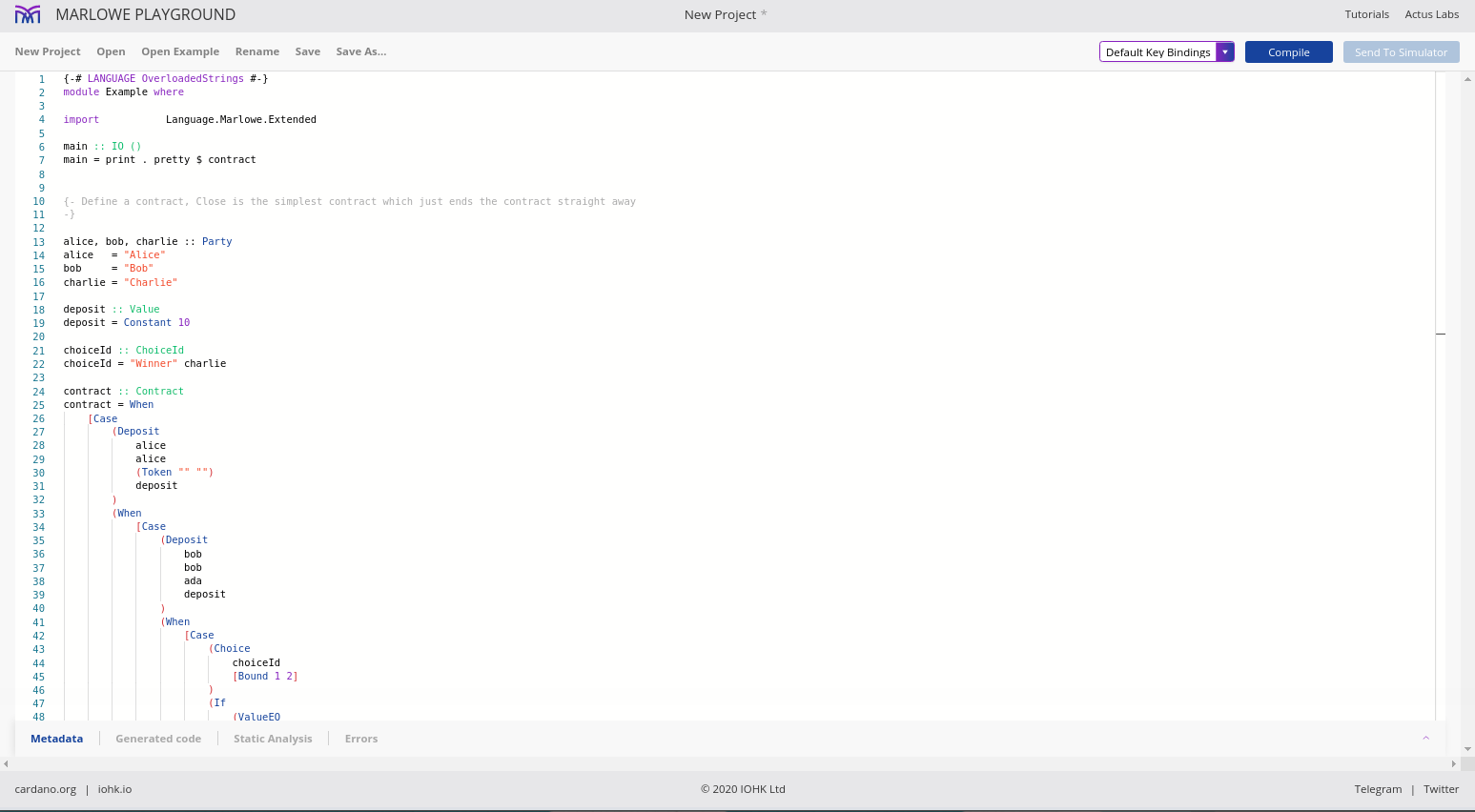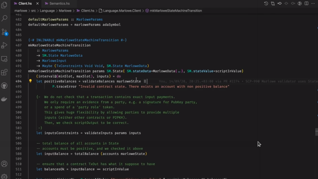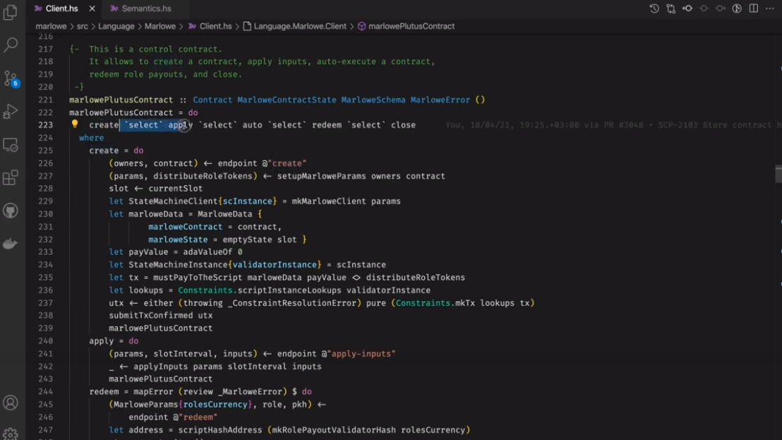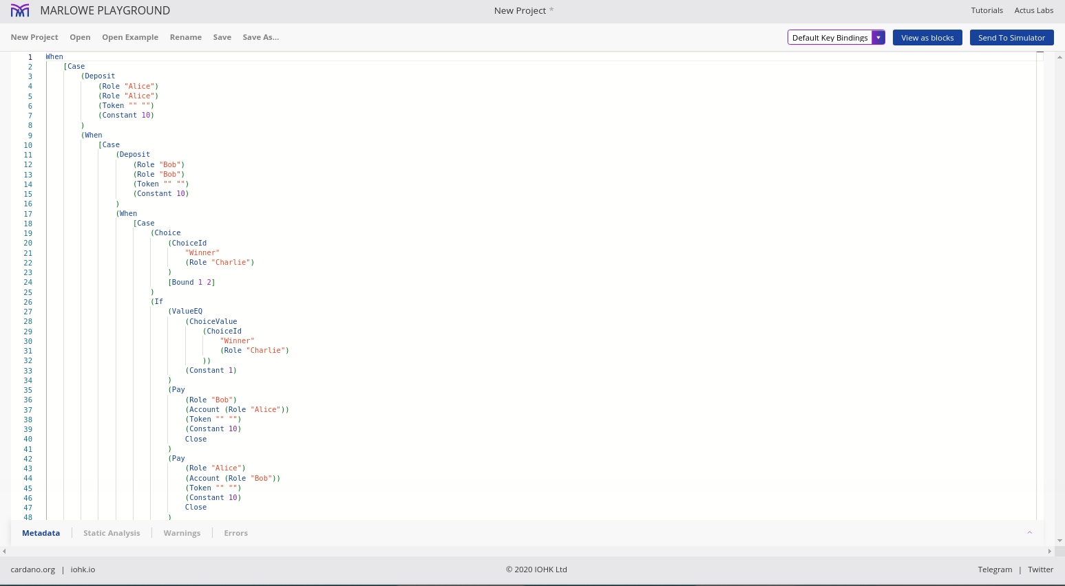 Điều đáng chú ý ở đây là Marlowe, trái ngược với Plutus, rất đơn giản là Haskell. Nhóm Marlowe đã đưa ra quan điểm là chỉ sử dụng các tính năng Haskell cơ bản. Bạn không cần ống kính, bạn không cần Template Haskell, bạn thậm chí không cần monads hoặc lập trình cấp kiểu.