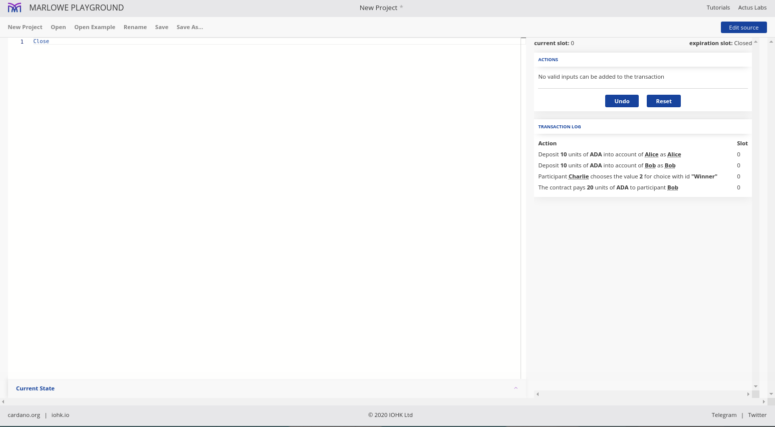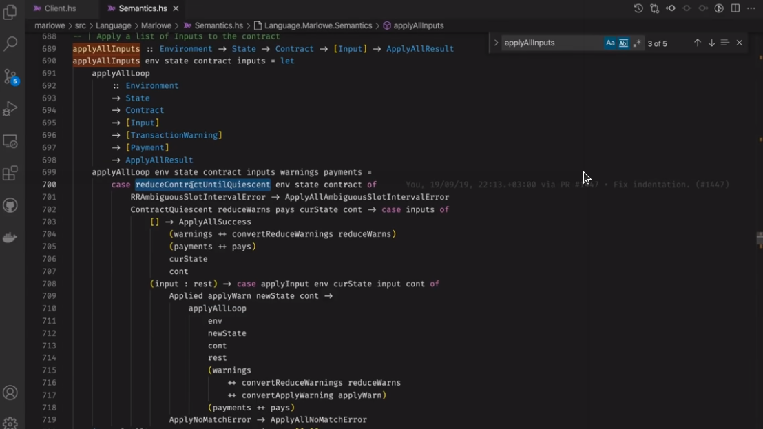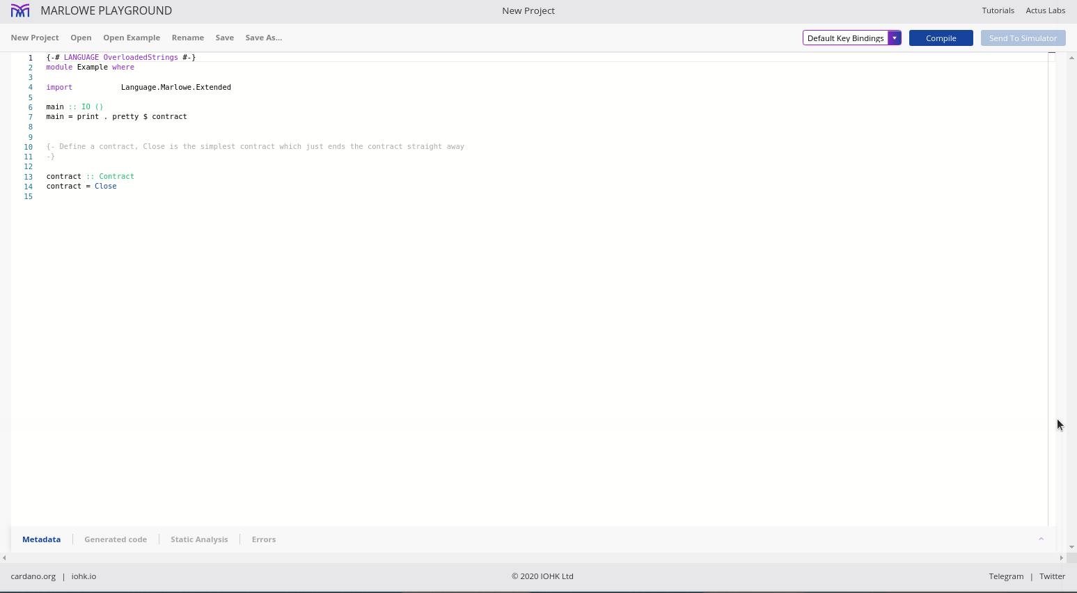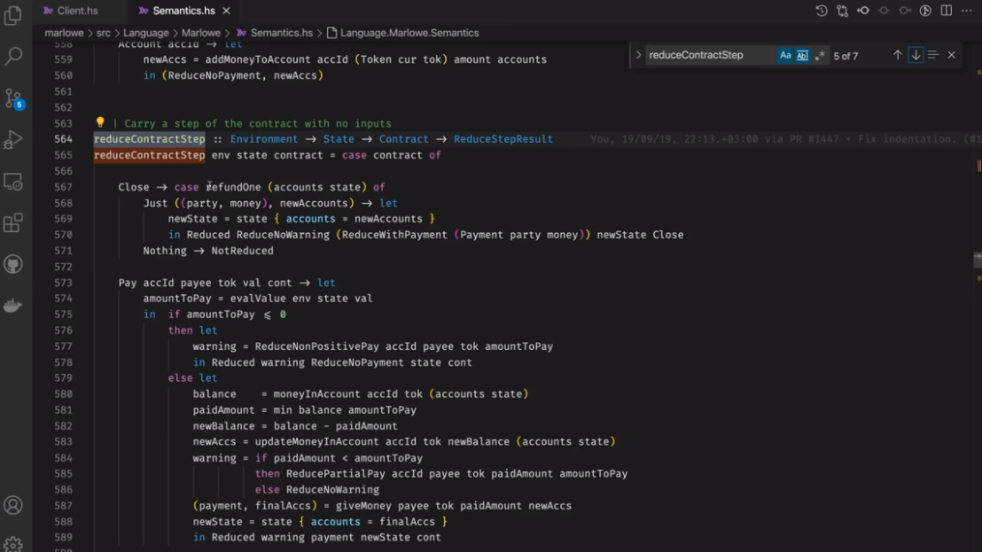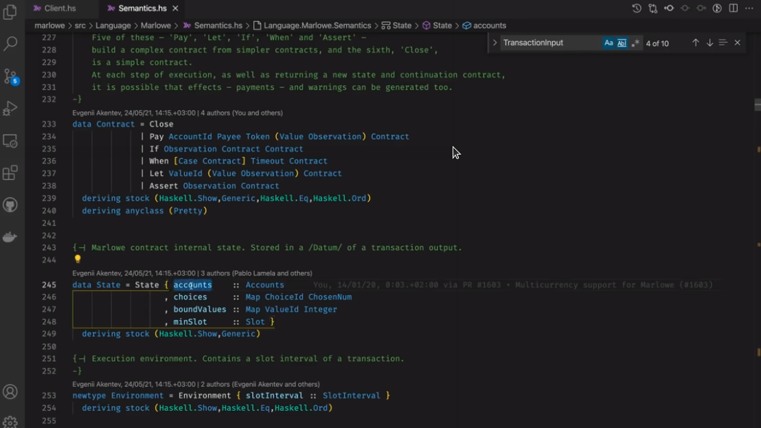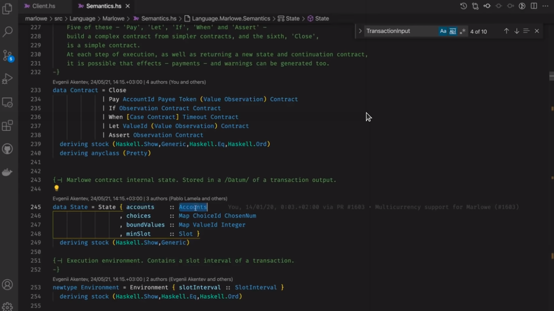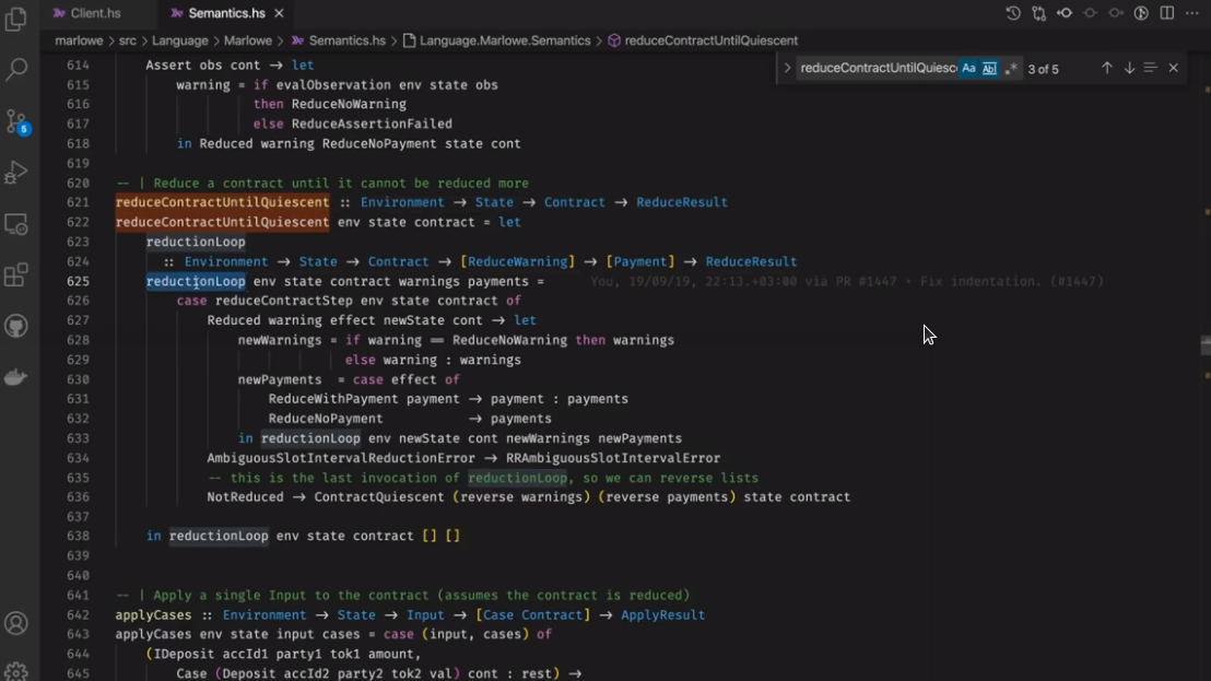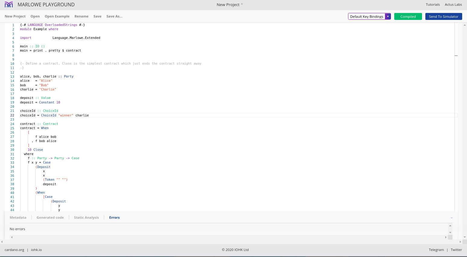 Điều đáng chú ý ở đây là Marlowe, trái ngược với Plutus, rất đơn giản là Haskell. Nhóm Marlowe đã đưa ra quan điểm là chỉ sử dụng các tính năng Haskell cơ bản. Bạn không cần ống kính, bạn không cần Template Haskell, bạn thậm chí không cần monads hoặc lập trình cấp kiểu.