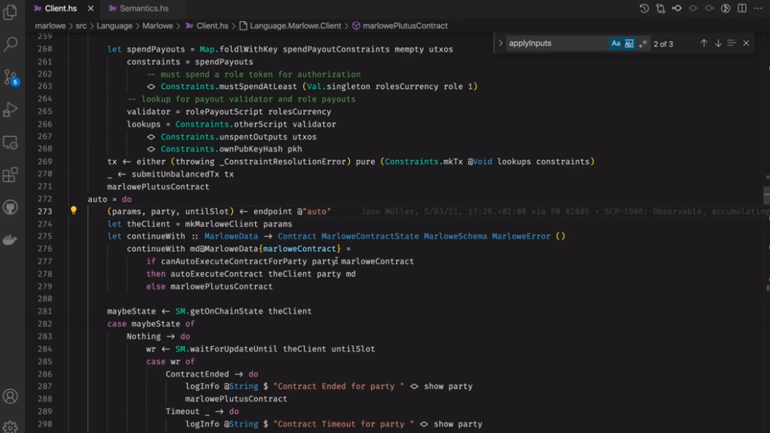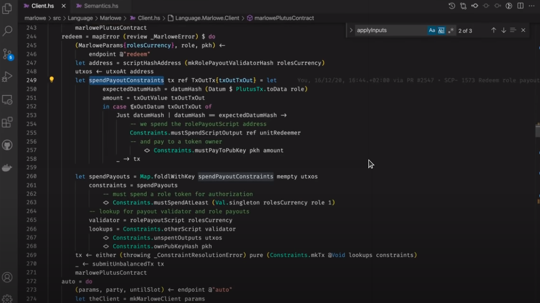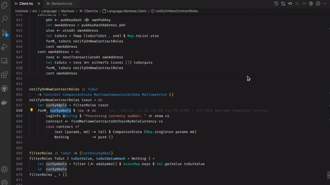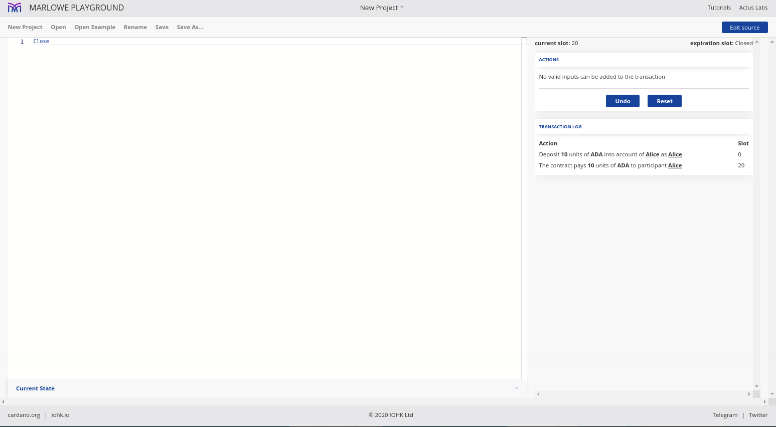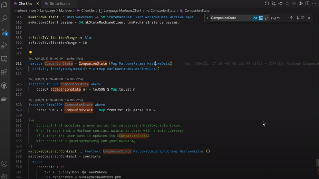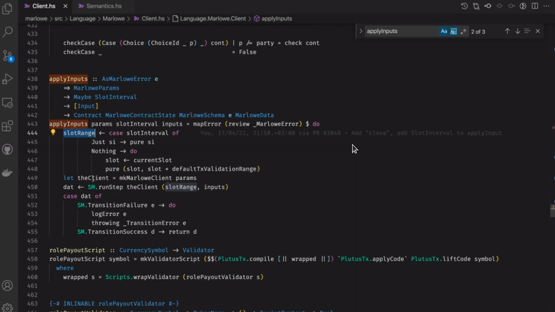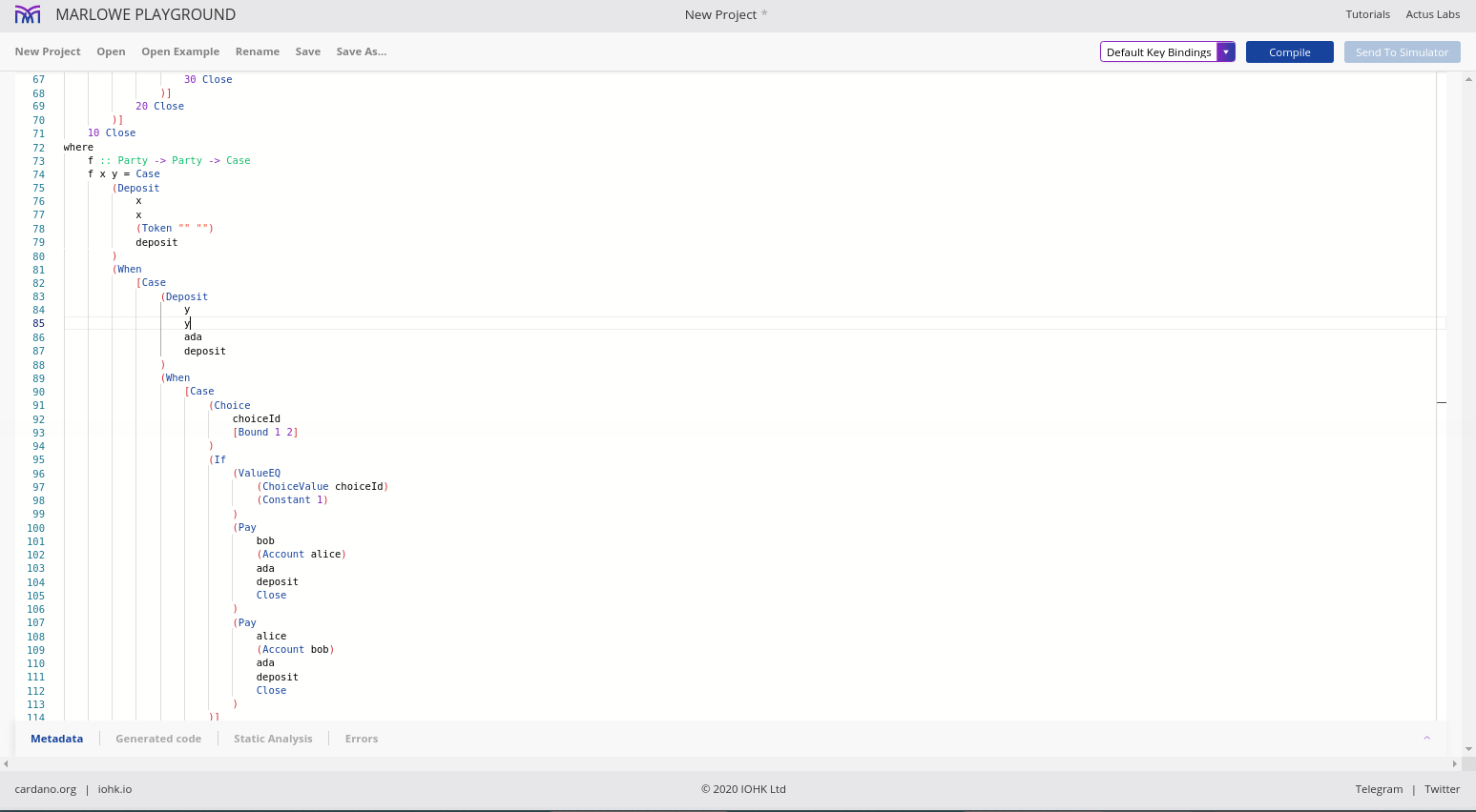 Điều đáng chú ý ở đây là Marlowe, trái ngược với Plutus, rất đơn giản là Haskell. Nhóm Marlowe đã đưa ra quan điểm là chỉ sử dụng các tính năng Haskell cơ bản. Bạn không cần ống kính, bạn không cần Template Haskell, bạn thậm chí không cần monads hoặc lập trình cấp kiểu.