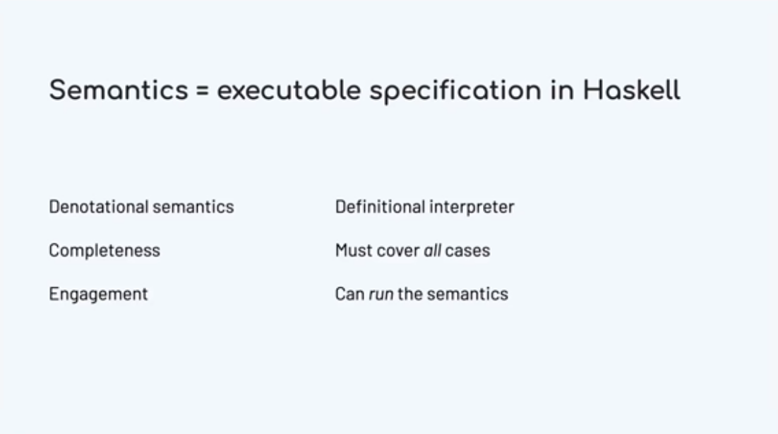 Khi chúng tôi viết một DSL, chúng tôi nhận được một số lợi thế. Chúng ta có thể viết ra mọi thứ trong lĩnh vực đó, nhưng có lẽ chúng ta không thể viết nhiều nhất có thể bằng một ngôn ngữ dành cho mục đích chung. Và, nếu chúng tôi làm việc trong bối cảnh chuyên biệt hơn này, chúng tôi có lợi thế là có thể cung cấp cho mọi người phản hồi tốt hơn và thông báo lỗi tốt hơn. Chúng tôi cũng có thể đưa ra nhiều đảm bảo hơn về hành vi của chương trình. Đó là một trong những điều sẽ được nhấn mạnh trong bài giảng này.
