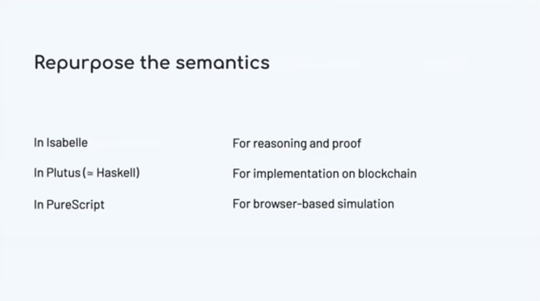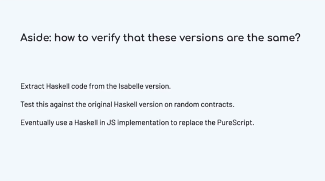 Trên thực tế, chúng ta có thể làm được nhiều hơn thế. Bởi vì chúng đặc biệt bị hạn chế, chúng tôi có thể khám phá mọi hành vi có thể có mà một hợp đồng có thể thực hiện, trước khi nó được thực thi. Vì vậy, chúng tôi có thể đưa ra những đảm bảo đầy đủ về cách một hợp đồng sẽ hoạt động như thế nào, không chỉ trong một hoặc hai lần kiểm tra, mà còn trên mọi trình tự thực hiện có thể.