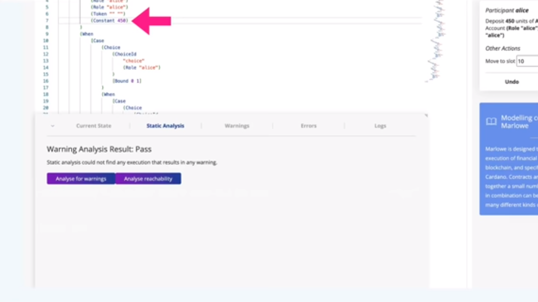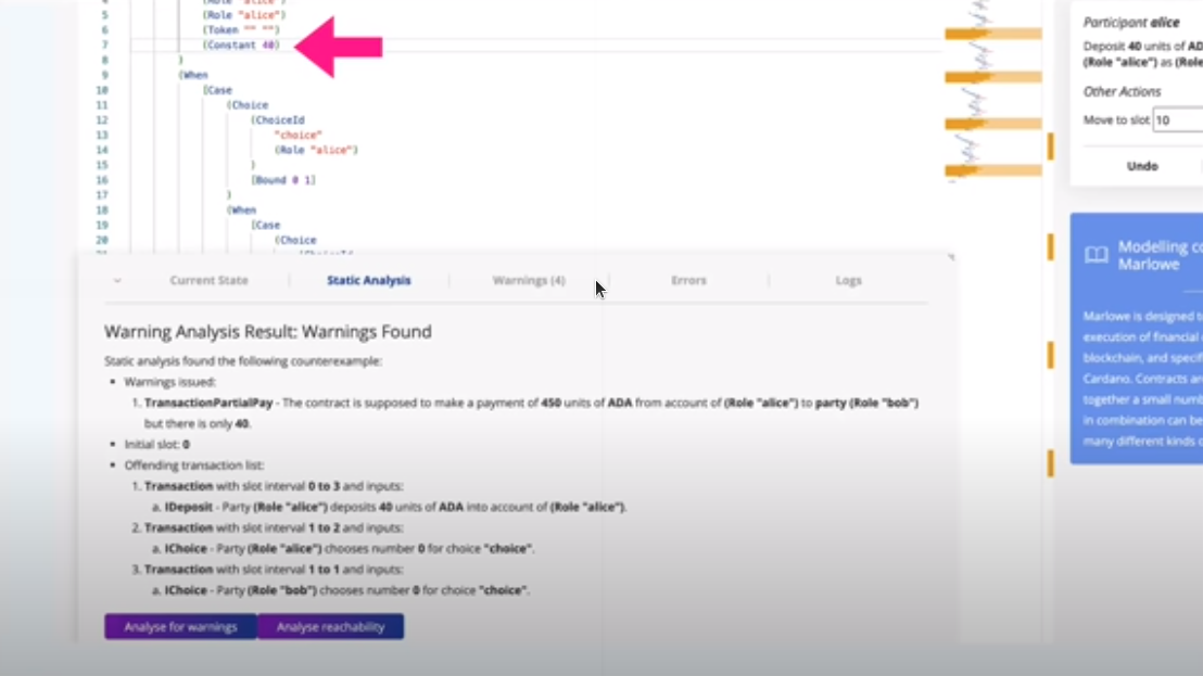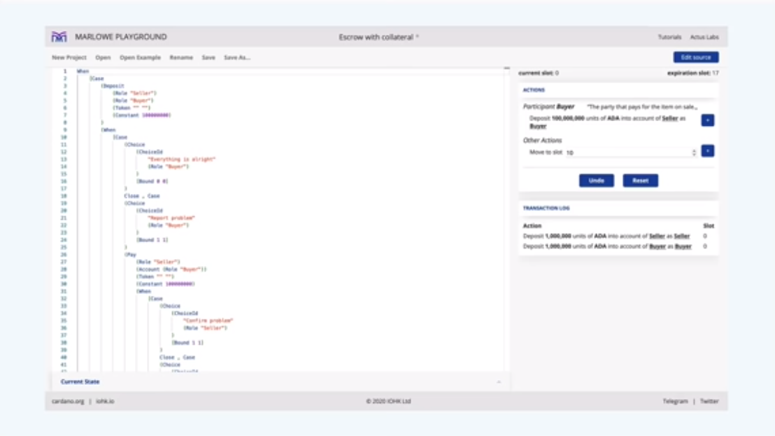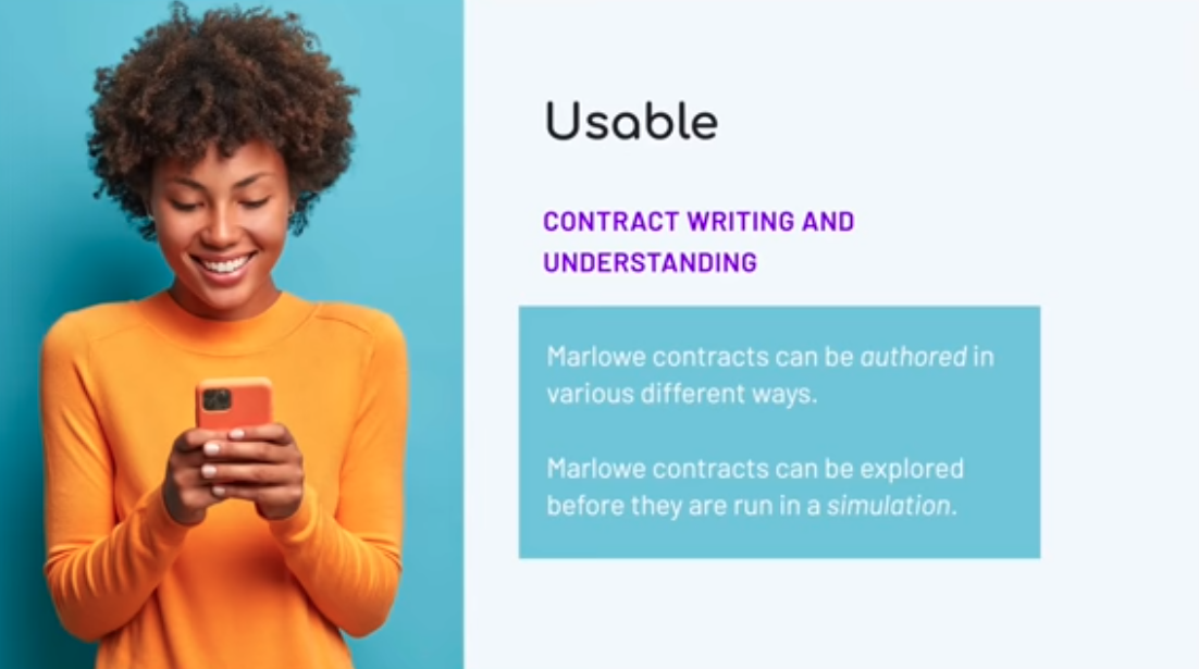 Chúng tôi đã thiết kế ngôn ngữ trở nên đơn giản nhất có thể và việc triển khai phản ánh điều đó và chúng ta sẽ nói một chút về điều đó sau. Hợp đồng rất hay và dễ đọc, đồng thời chúng tôi cũng có thể dễ dàng mô phỏng chúng, vì vậy chúng tôi có thể trình bày cho người dùng một bức tranh rất rõ ràng về cách hợp đồng của họ trong Marlowe sẽ hoạt động.