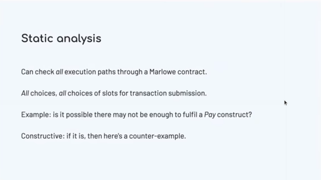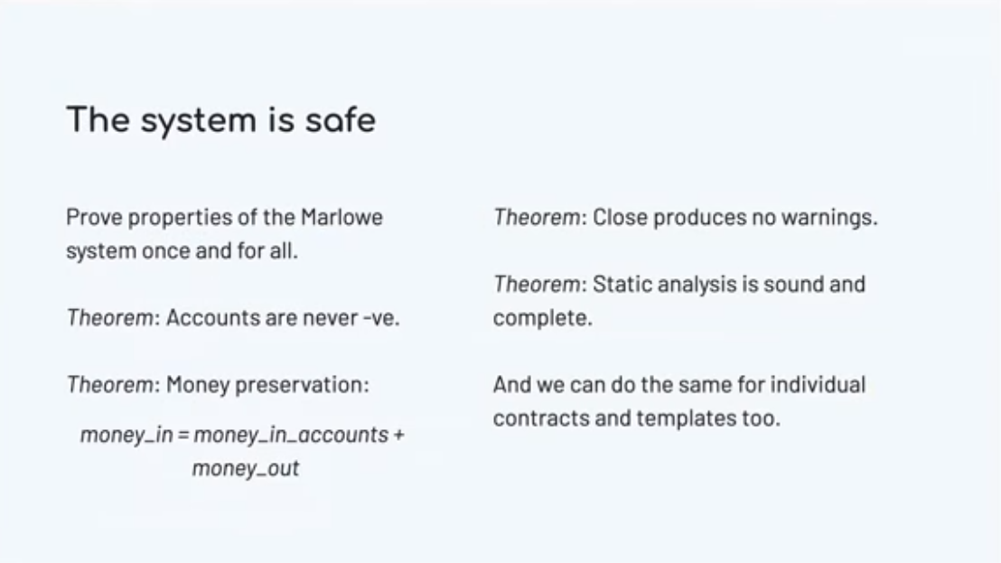We can be sure that contracts will terminate. We do that by putting timeouts on every external action. Every choice, every deposit of money into the contract comes with a deadline. Marlowe contracts cannot wait forever for somebody to make a choice or for an action to happen. If you hit the timeout then an alternative course is taken.