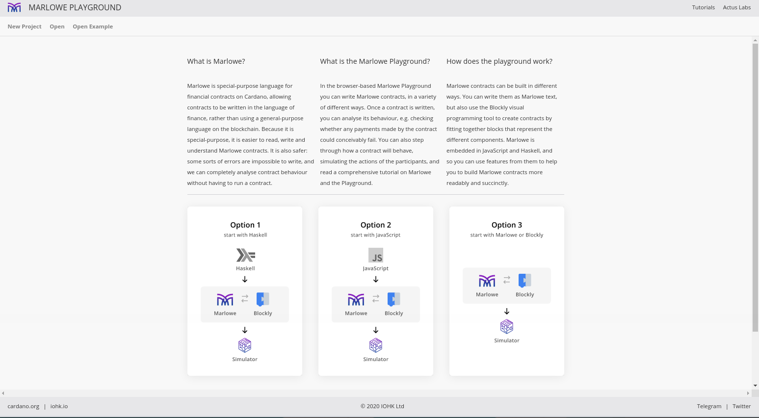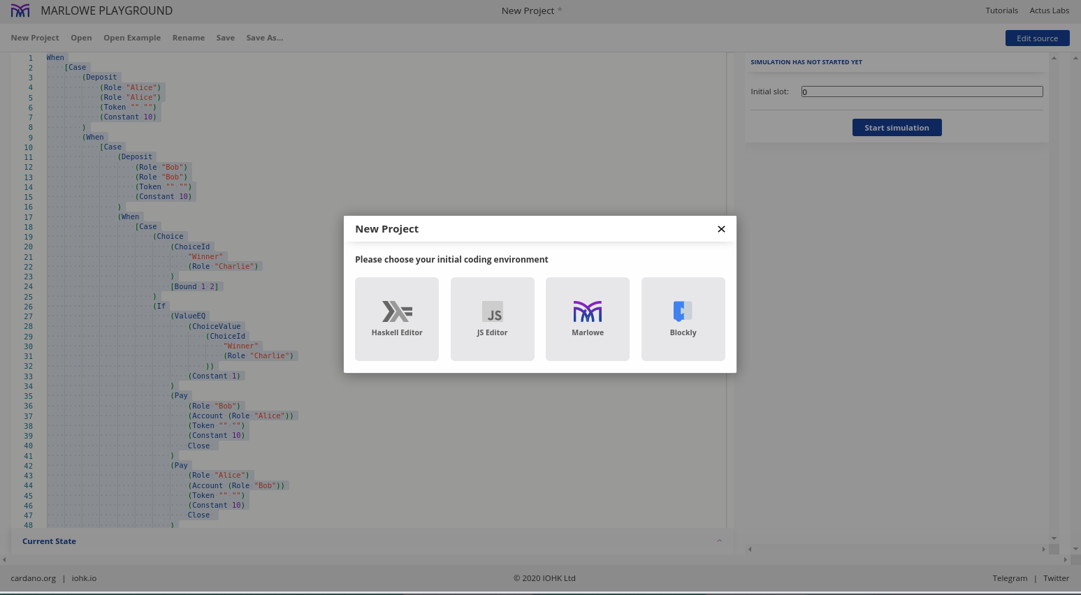 Khi bạn đến sân chơi, trước tiên bạn sẽ được đưa ra với ba tùy chọn để bạn chọn bằng ngôn ngữ nào bạn muốn viết các hợp đồng Marlowe của mình.