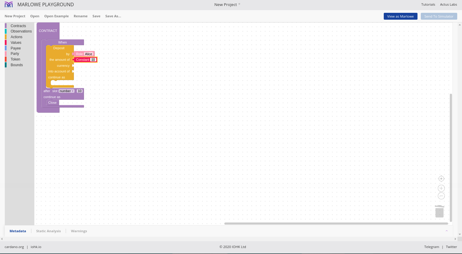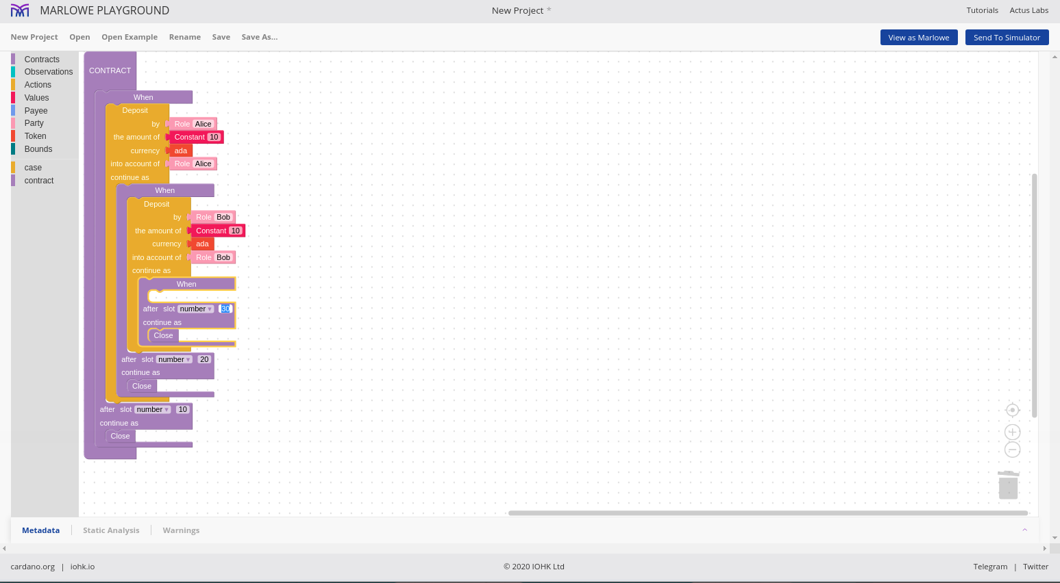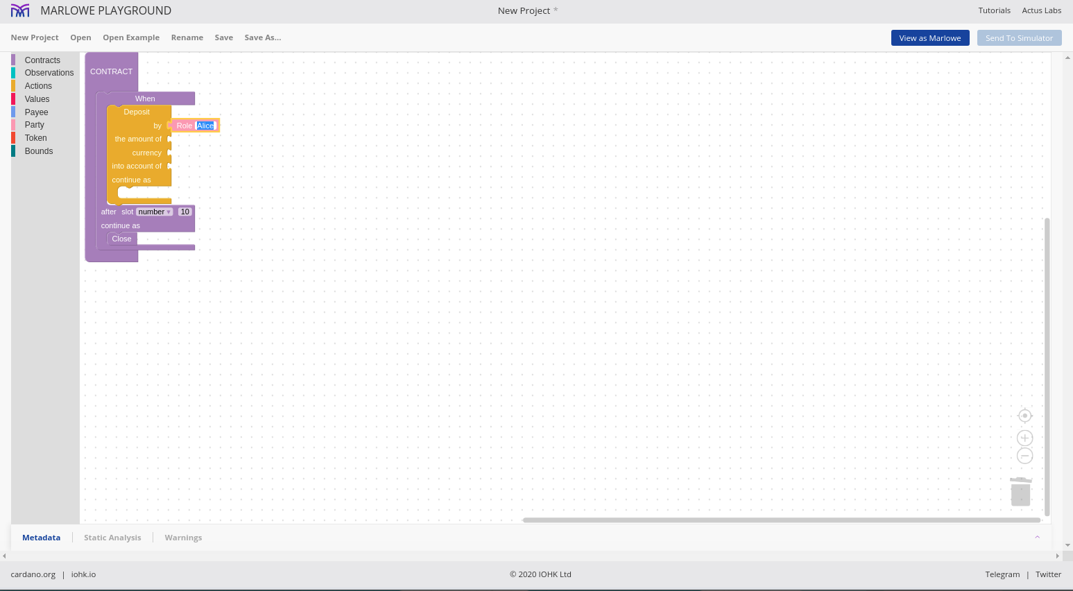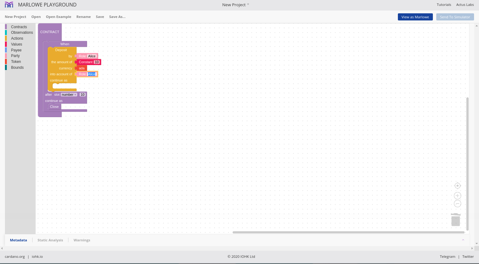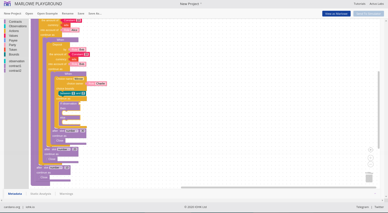 Chúng tôi cho phép các hợp đồng được mô phỏng một cách tương tác và chúng tôi gọi đó là Marlowe Play. Chúng tôi cho phép các hợp đồng được xây dựng theo nhiều cách khác nhau và chúng tôi gọi đó là Xây dựng Marlowe. Trên thực tế, những gì chúng tôi đã làm vào lúc này là gộp hai thứ đó - Marlowe Play và Build - vào cái mà chúng tôi gọi là Marlowe Playground.