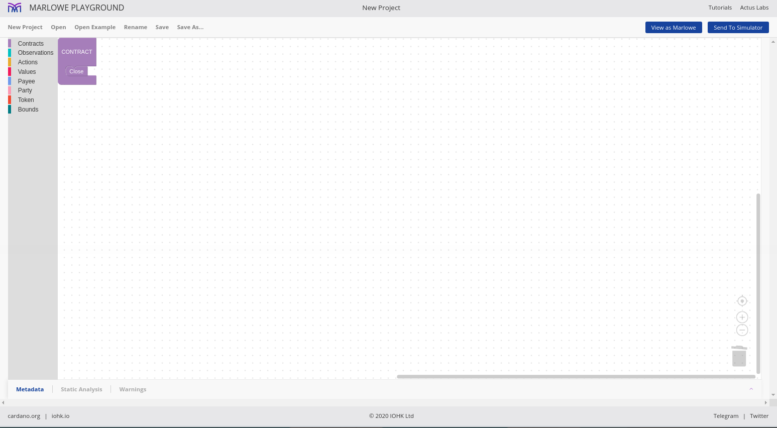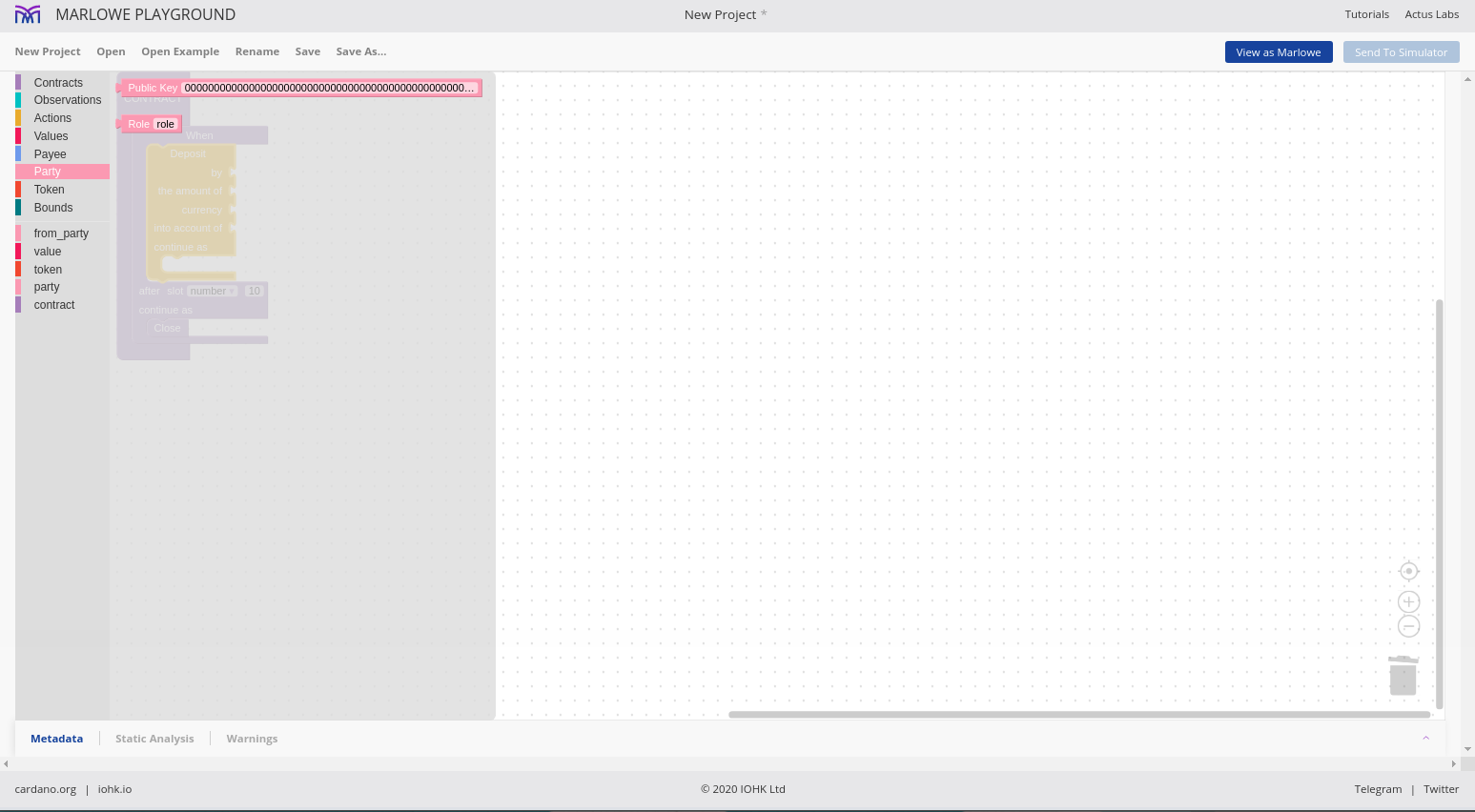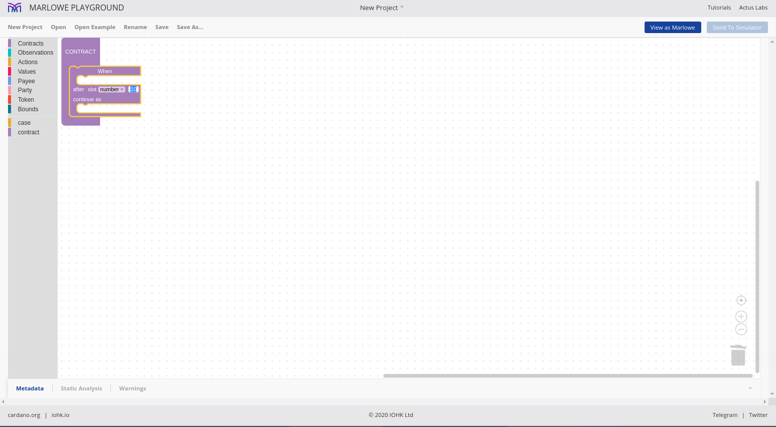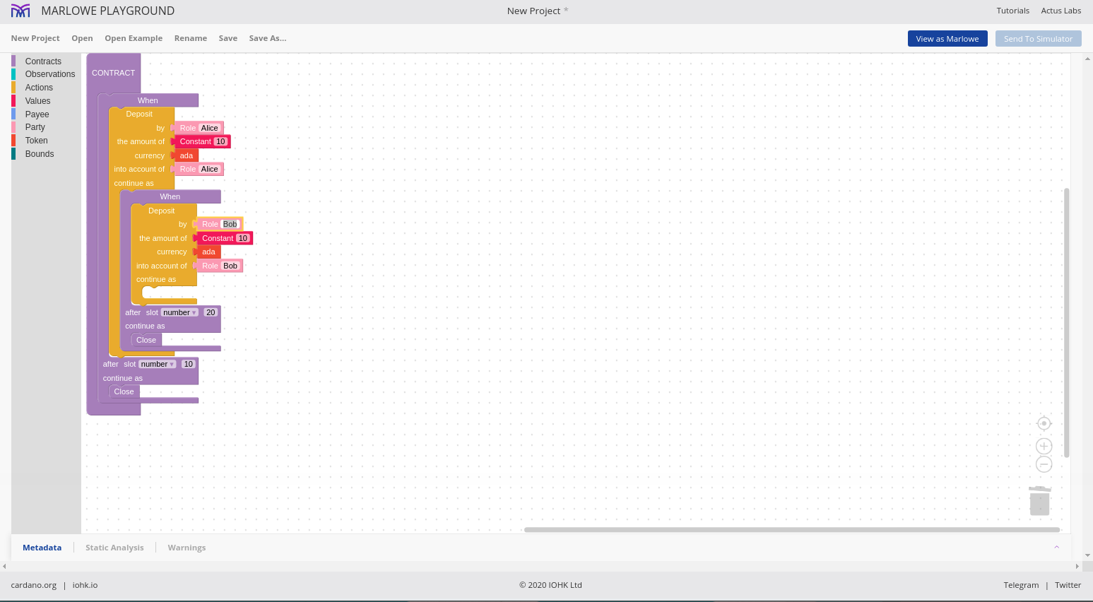 Chúng tôi cho phép các hợp đồng được mô phỏng một cách tương tác và chúng tôi gọi đó là Marlowe Play. Chúng tôi cho phép các hợp đồng được xây dựng theo nhiều cách khác nhau và chúng tôi gọi đó là Xây dựng Marlowe. Trên thực tế, những gì chúng tôi đã làm vào lúc này là gộp hai thứ đó - Marlowe Play và Build - vào cái mà chúng tôi gọi là Marlowe Playground.