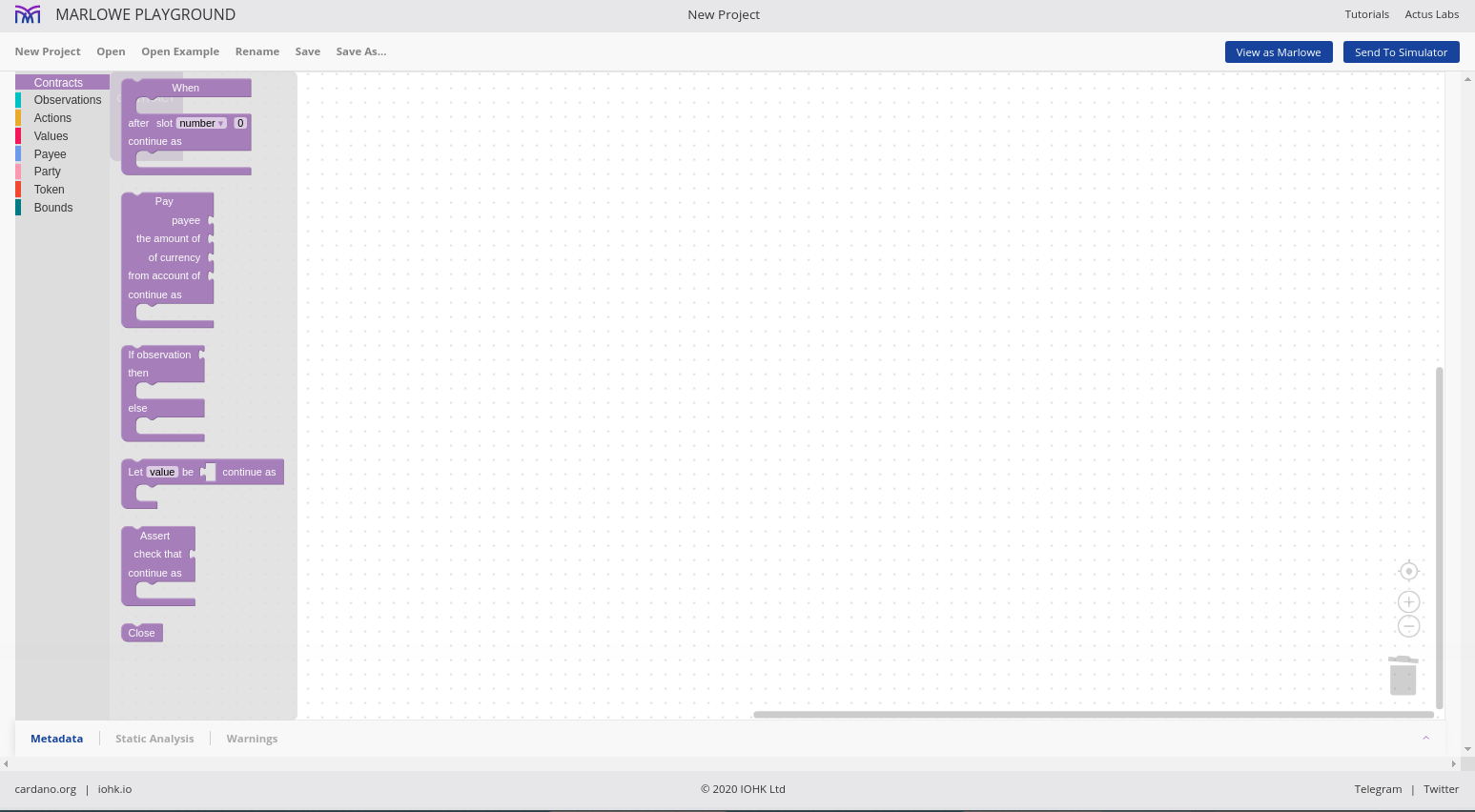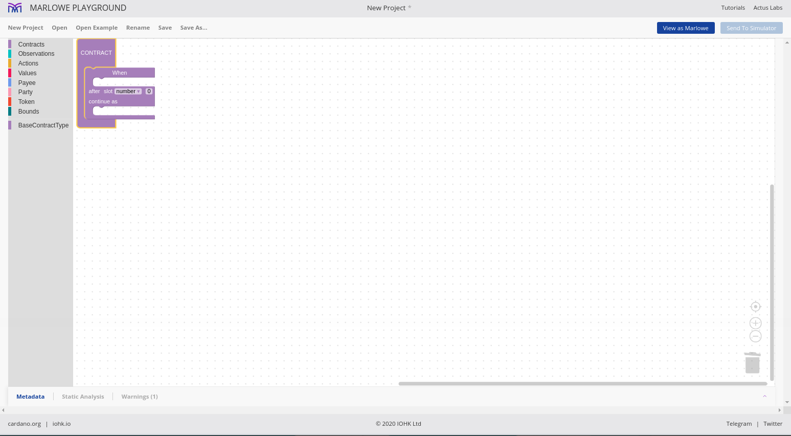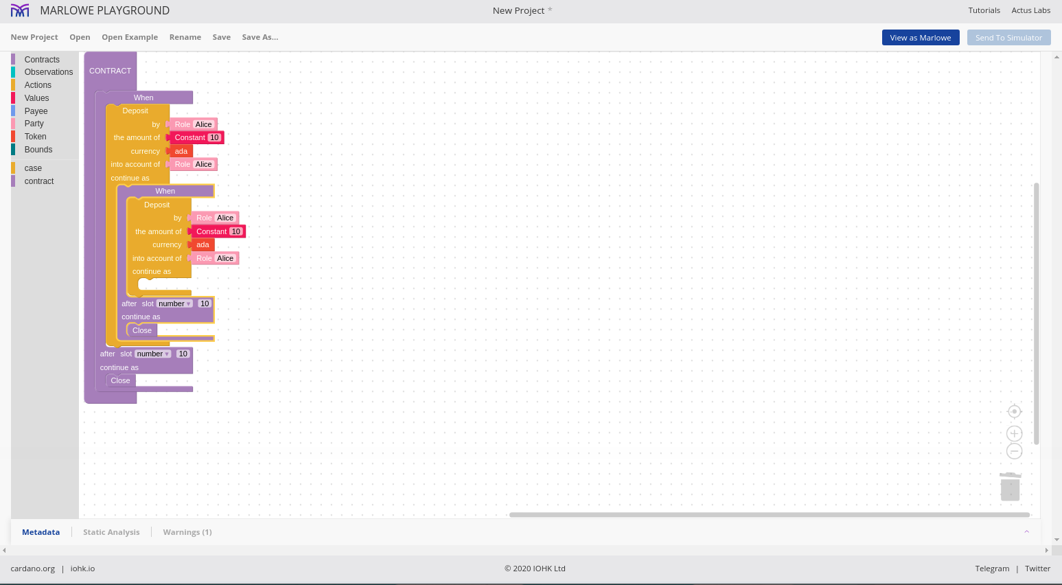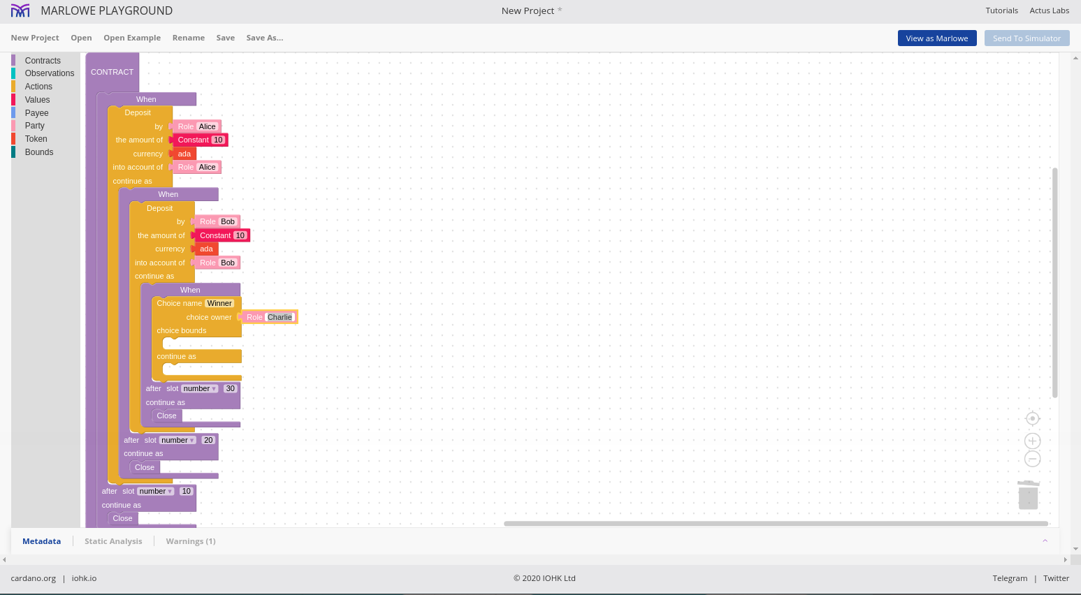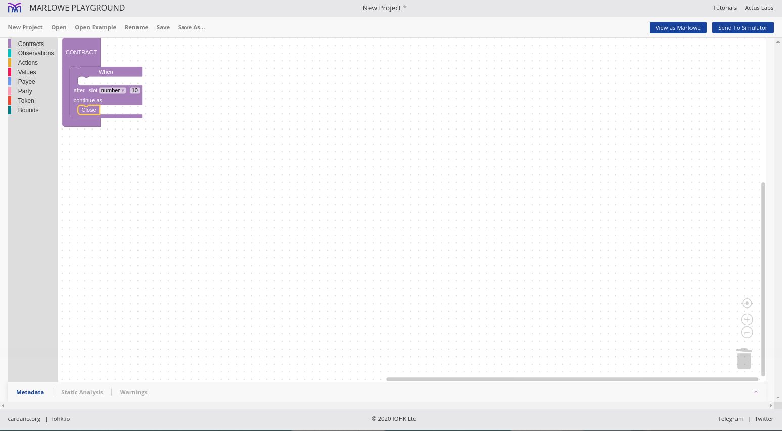 Chúng tôi cho phép các hợp đồng được mô phỏng một cách tương tác và chúng tôi gọi đó là Marlowe Play. Chúng tôi cho phép các hợp đồng được xây dựng theo nhiều cách khác nhau và chúng tôi gọi đó là Xây dựng Marlowe. Trên thực tế, những gì chúng tôi đã làm vào lúc này là gộp hai thứ đó - Marlowe Play và Build - vào cái mà chúng tôi gọi là Marlowe Playground.