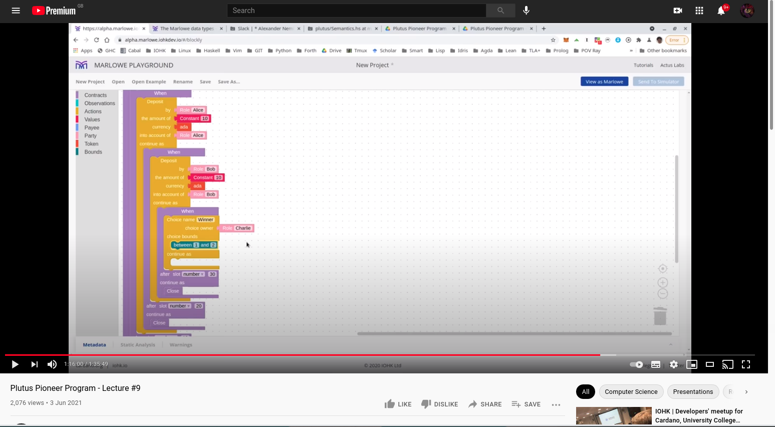Ở đó, chúng tôi không thực sự thấy lợi ích của việc làm điều đó trong Haskell, chúng tôi cũng có thể làm điều đó trong Blockly, mặc dù bạn có thể thấy rằng Blockly thực sự chỉ hữu ích cho việc học và viết các hợp đồng cực kỳ đơn giản. Chúng tôi vừa mới viết một hợp đồng đơn giản và nó đã bắt đầu khá khó sử dụng trong trình chỉnh sửa Blockly. Nếu bạn làm điều gì đó phức tạp hơn, nó có thể bắt đầu rất khó hiểu trong trình chỉnh sửa.