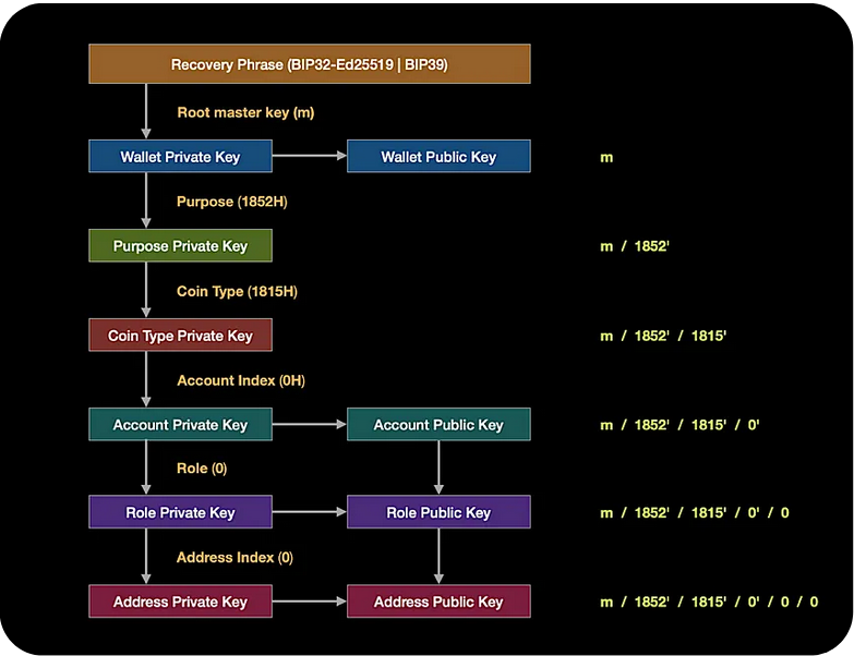 Các khóa thanh toán khác có thể được tạo bằng cách tăng số cuối cùng trong đường dẫn xuất 1852H/1815H/0H/0/0. Các khóa thanh toán từ Trezor Model T có được bằng cách tăng chữ số cuối cùng này, nhưng các khóa dành cho ví Daedalus có được từ việc tăng chữ số cuối cùng của đường dẫn xuất 1852H/1815H/0H/0/0 và 1852H/1815H/0H/1/0.