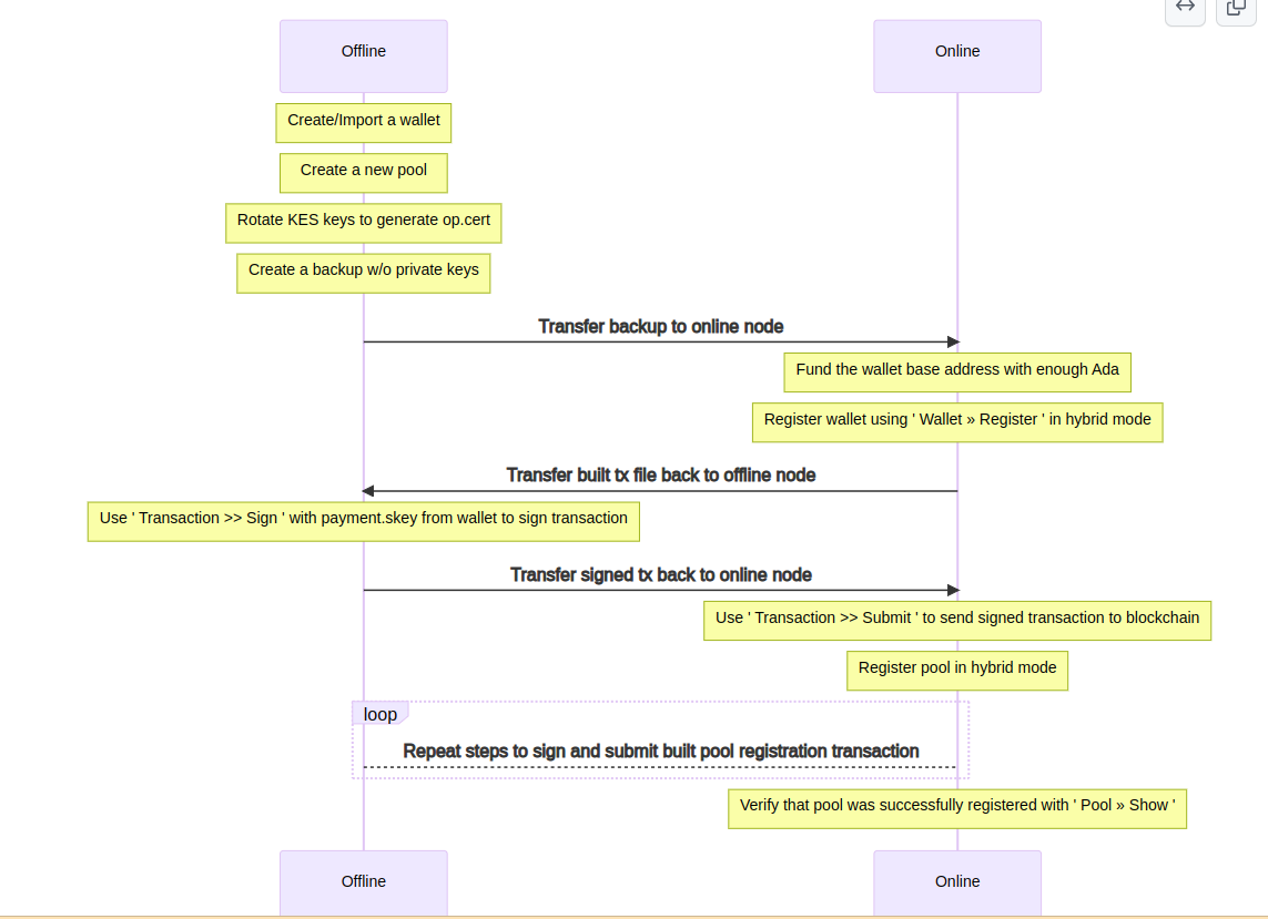 - Với quy trình này bạn phải tuân thủ để đảm bảo bảo mật tất các skey quan trọng. (Tạo ví và tạo pool toàn bộ trên máy Air-gap rồi copy các file trừ các key quan trọng nêu ở trên)