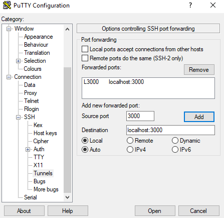 Hoặc, nếu bạn dùng putty để đăng nhập SSH bạn có thể cấu hình Tunel ssh như sau. Đảm bảo rằng bạn chọn nút "Add" và lưu vào thành profile của Putty.